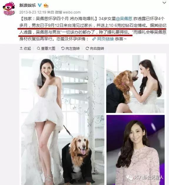 2013年9月,吴佩慈自爆已经怀孕,孩子的爸爸是纪晓波,据说当时两人已见过双方父母,纪晓波还送了她10克拉的钻戒。