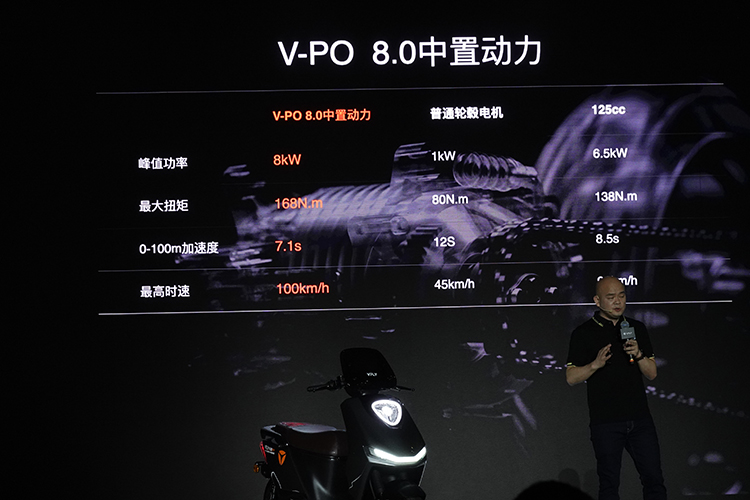 雅迪VFLY F130电动摩托车采用了V-PO 8.0中置动力,峰值功率可达8kW,峰值扭矩168牛·米,0-100m加速7.1s,最高时速可达100km/h。一次充电续航可达120km,并且支持20分钟快充,将来还能支持5分钟极速闪充。但发布会上没有公布价格。