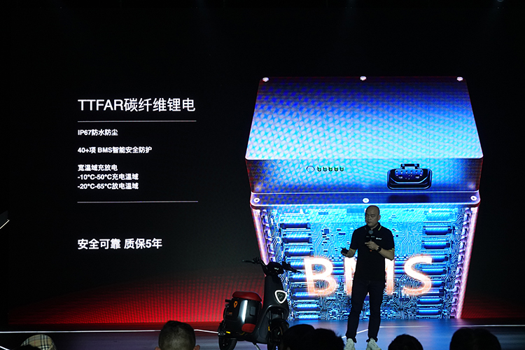 再一个是电池,在这个行业里,市面上基本都是3年质保。我们这一次洞察用户对长续航、安全,还有长寿命的要求,所以我们加入了碳纤维的材料,它可以对正负极导电性发挥的更好,寿命会更长。所以我们这次的碳纤维电池,可以做到五年质保。而且它可以达到需求里程,像我们目前发布的L100,它可以确保续航100公里以上。