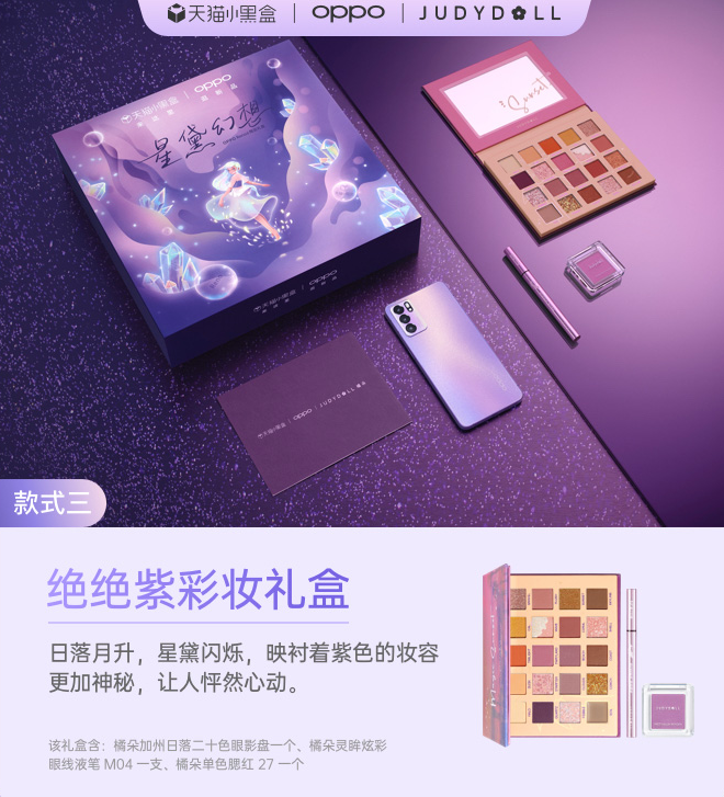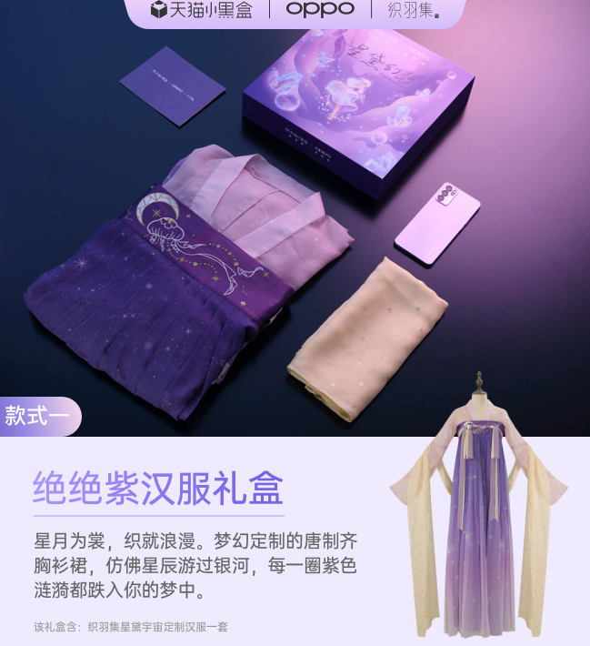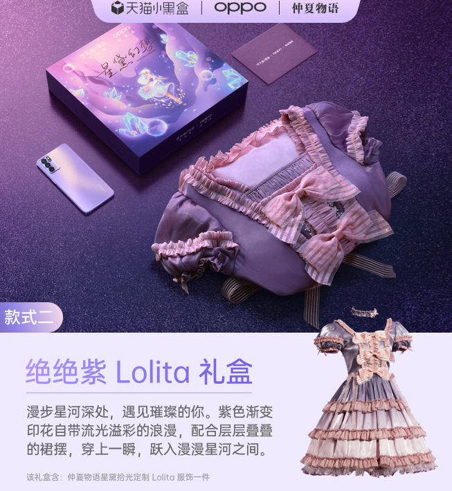 此外,OPPO 还同时推出了“星黛幻想限定礼盒”,共有 3 款盲盒样式,内含汉服、Lolita、彩妆,购 OPPO Reno6 星黛紫配色手机,加 19.9 元即可抢购盲盒。