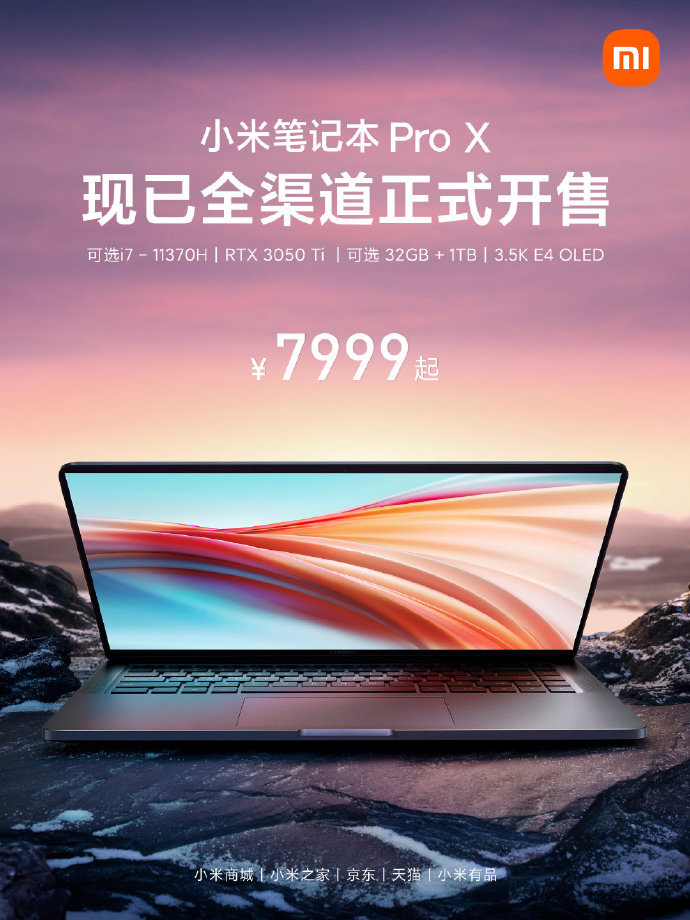上月底小米发布了旗舰笔记本小米笔记本 Pro X,搭载 RTX 3050 Ti 光追独显、11 代英特尔酷睿高性能 H35 移动处理器,7999 元起,今日该笔记本正式全渠道开售。