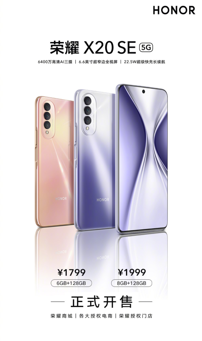 荣耀 X20 SE 手机的 6GB+128GB 版本售价 1799 元,8GB+128GB 版本售价 1999 元,将在今日上午 10 : 08 正式开售。