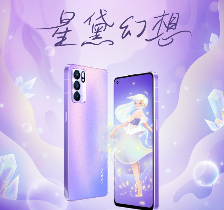 OPPO Reno6 手机搭载天玑 900 芯片,采用 6.4 英寸 2.5D 高感屏,支持 90Hz 刷新率,采用一体化铝合金中框,目前有星黛紫、夜海、夏日晴海、星河入梦四款配色。