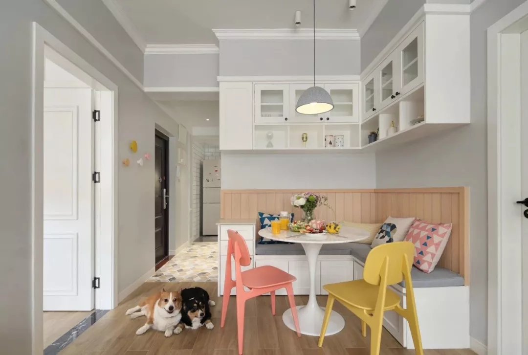 小户型的餐厅也有很多屋主是会做卡座的设计,这样卡座搭配护墙板和上方的吊柜,基本上就占满了餐厅的背景墙了,收纳能力超强。