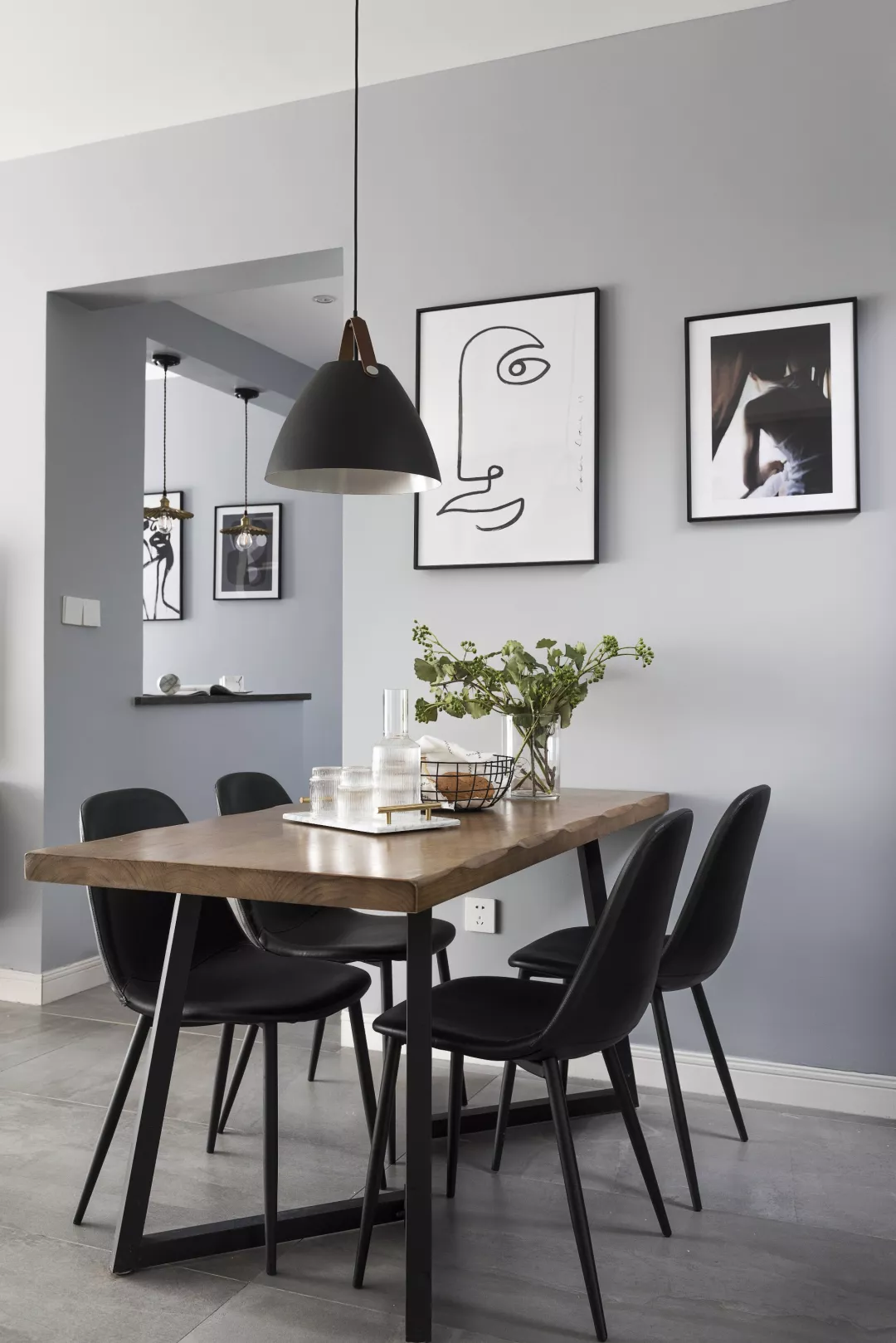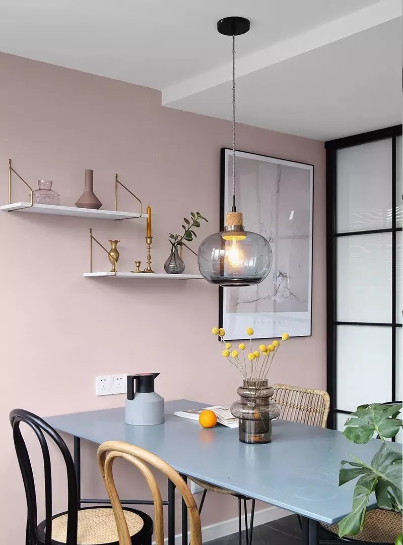 餐厅的背景墙设计也适合比较简约一些,把整面墙刷上乳胶漆,然后挂上一幅装饰画,还可以加上隔板、置物架,增强小户型的储物能力。