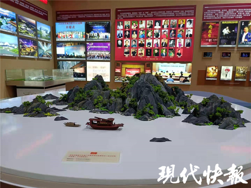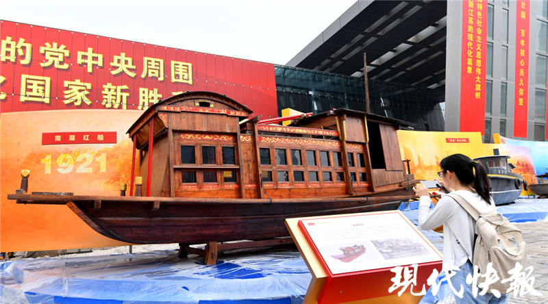 一艘按照 1:2 比例制作的南湖红船模型昂首矗立在展览开篇。现代快报记者了解到,这艘南湖红船模型由江苏海事职业技术学院承制,制作参考的正是 1959 年制作嘉兴南湖红船的图纸。