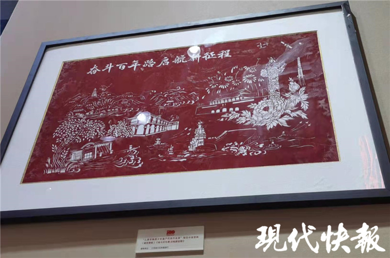 抬眼望去,墙上还悬挂了一幅南京剪纸作品《奋斗百年路 启航新征程》,方寸间还原百年模样。剪纸作品展现了南湖红船、井冈山星火、遵义会议旧址、延安宝塔山、天安门、辽宁舰等标志性场景,并以国花牡丹为背景,烘托中国共产党领导下伟大祖国的繁荣富强。