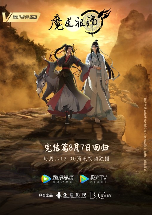 新京报讯(记者 杨莲洁)7月9日,动画《魔道祖师》完结篇定档,官宣将于8月7日在腾讯视频独家播出,每周六12:00更新1集,VIP抢先看1集。