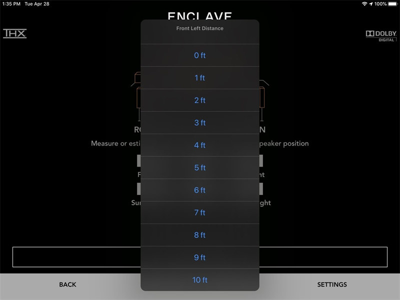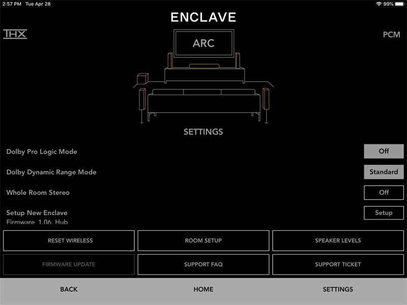 系统启动后,APP的主界面会显示典型家庭影院环境的线条图,书柜上有电视、沙发和CineHub。轻轻点击任何一个音箱都会响起测试音,这样可以检查音箱是否正常工作。在APP的设置界面,Enclave可以设定音箱到皇帝位的距离,然后进行精确的延时计算来达到优美的视听效果。您还可以通过调节指定分贝值或通过点击加、减号来增强、减弱每一个扬声器的输出音量。