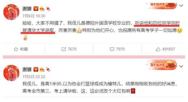 7月5日,娜娜宣布自己的侄子,身高1.95米,高考第三名,被清华大学录取。
