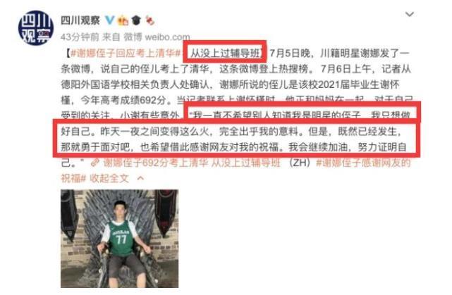 娜娜的侄子考上清华大学后,有媒体采访了谢怀瑾本人,称他从未上过辅导班,不想被称为明星的侄子。正是这句话让网友误以为谢和她姑姑的关系疏远不亲和。