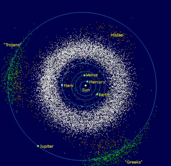 最常见的小行星类型是c型,又叫作碳质小行星,占全部小行星的75%,主要由硅酸盐岩石和粘土组成,呈灰色。第二常见的是S型,或石质小行星,呈泛绿的红色,由镍,铁和硅酸盐组成。最后,最稀有的主要类型小行星是M型金属小行星,它们全是红色的,主要由镍铁组成。还有更罕见的类型,比如V型,它形成了火山地壳。但是C和M型是主要的组成部分。但是小行星带本身是什么,是什么把这些小行星聚集在一起为什么它们还没有重新定位