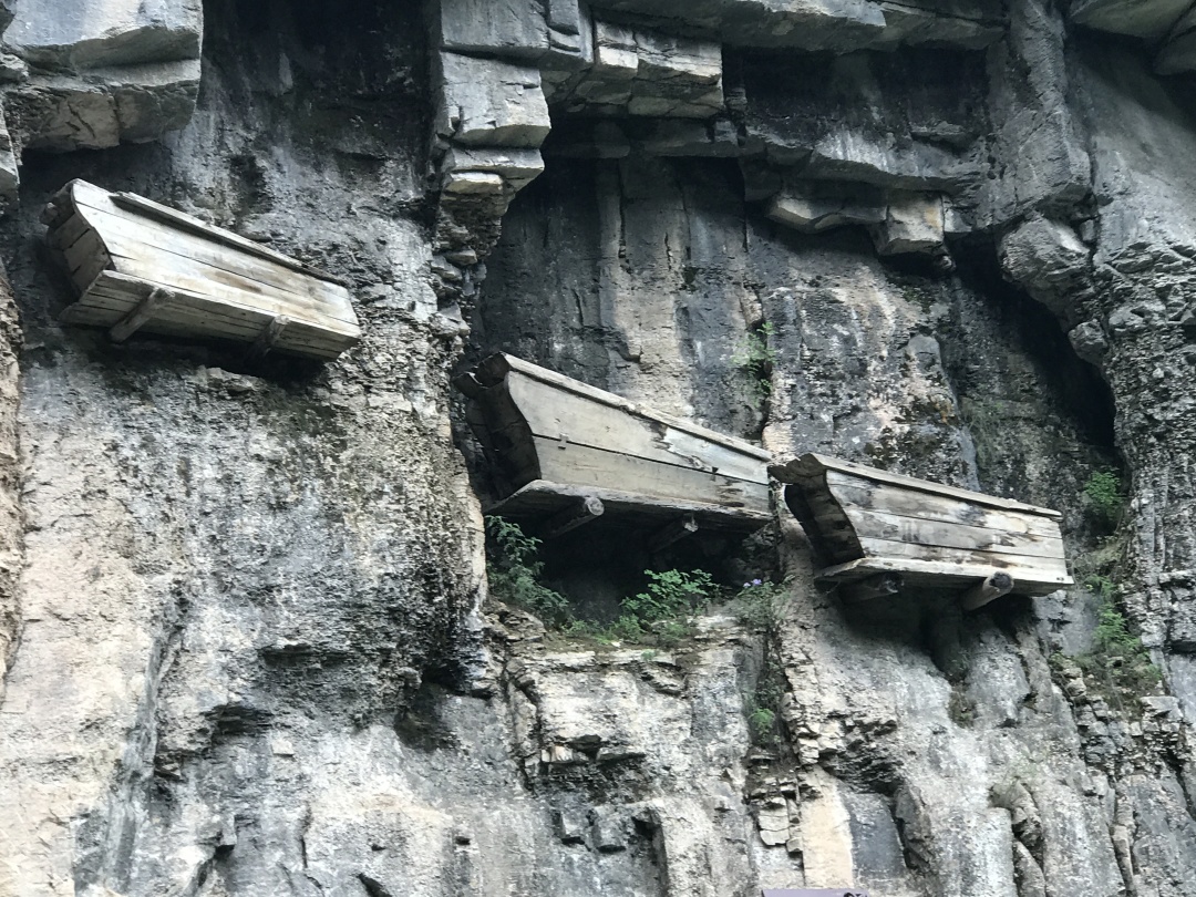 通过查阅资料发现,这种奇特的丧葬习俗在我国很多地方都有,大致分为三种形式:木桩式、崖洞式和横穴式。木桩式会将棺木放置于打在崖壁的木桩上,在福建、四川和湖南等地方较为常见;崖洞式是放在临河悬崖的天然裂缝或者洞穴内;横穴式则凿壁为穴,或者利用狭窄的天然崖缘来搁置棺木,在台湾和沿海地方曾经发现过。贵州安顺格凸河地区为后两种方式。