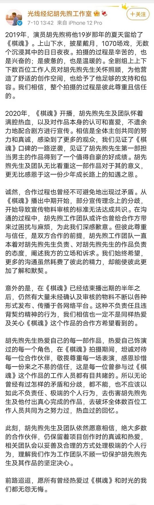 新京报讯 7月10日,胡先煦工作室发布长文回应与《棋魂》剧方矛盾。文中称,从《棋魂》播出中期开始,部分宣传理念上的分歧,导致胡先煦团队和剧方宣传物料审核的标准无法达成共识。在《棋魂》已经结束播出期的半年之后,仍然有大量未经确认及审核的物料不断以各种形式发布、传播于各网络平台,“这种不负责任且违背契约精神的行为,我们相信也一定不是同样热爱及关心《棋魂》这个作品的合作方希望看到的。”