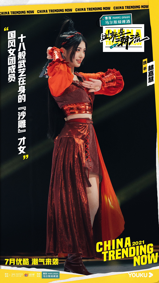此前,林嘉慧便在《创造2020》中积累了一定的人气并以幽默的接梗能力在节目中展现了艺能,给大家留下了深刻的印象。而此次在《这!就是潮流》,林嘉慧则在穿搭上大显身手,释放专属时尚魅力。在曝光的单人海报中,林嘉慧以一身红色带有汉服概念的长裙亮相,与极具古感的扇子相呼应,加上精神的高马尾与甜美的笑颜,既契合了SING女团的国风女团定位,又传达出个人刚柔兼具的性格,红与黑的搭配经典又亮眼,十分抓人眼球。