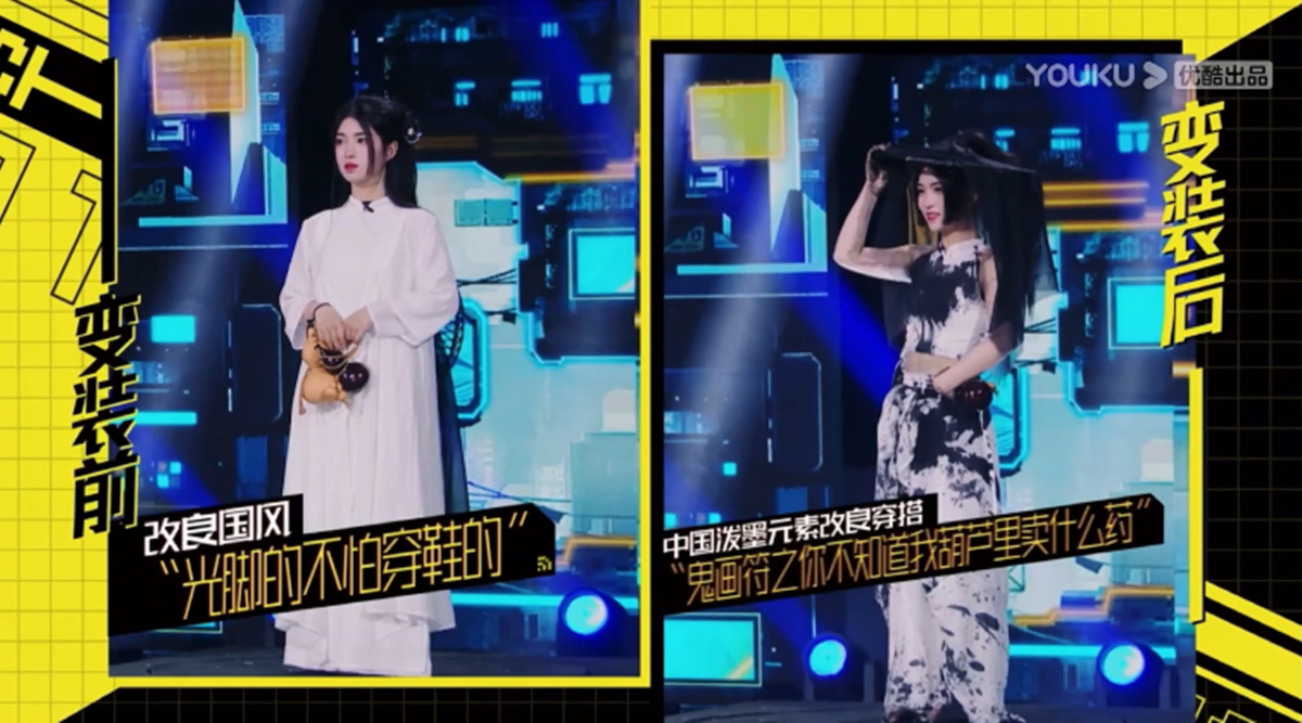 区别于海报中的抢眼配色,节目中,林嘉慧选择一袭自己亲手改良过的纯白色国风长衫亮相,立领设计与薄纱材质尽显温婉气质,木钗子与白色梨花的细节点缀更是点睛之笔,尽显少女巧思。而在一分钟变装秀环节,林嘉慧则放出了一技大招,拿出腰间的葫芦配饰在白衫上泼墨,以中国山水画中的手法“现场制作”,在短短的限定时间内,一改清爽纯白转而变成了极具侠女气息的黑白配色,引发现场主推官们的惊呼与好评。