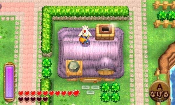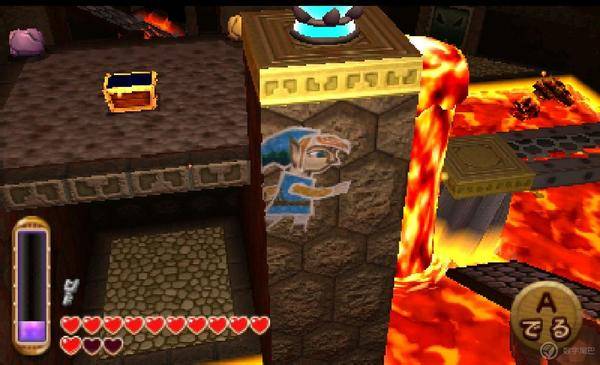 虽然是俯视视角,但游戏巧妙的运用了 3DS 的裸眼 3D 功能。很多迷宫同一个房间都分为好几层,在需要跳跃的时候,玩家能清晰的通过裸眼 3D 感知自己在哪里,应该去哪里。并且,玩家还有变身壁画的能力,在游戏中类似“次元裂缝”的地方能变身 2D 角色在墙壁上游走。这个时候游戏会自动切换成横版过关一样的2D视角,玩家能更好的感知更个迷宫。