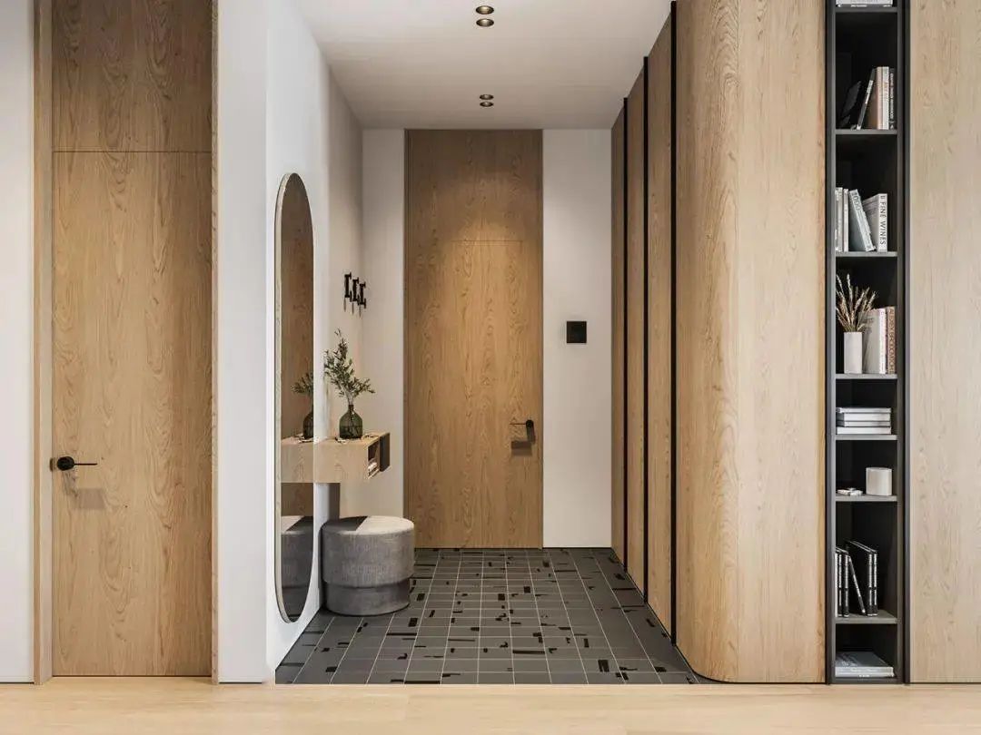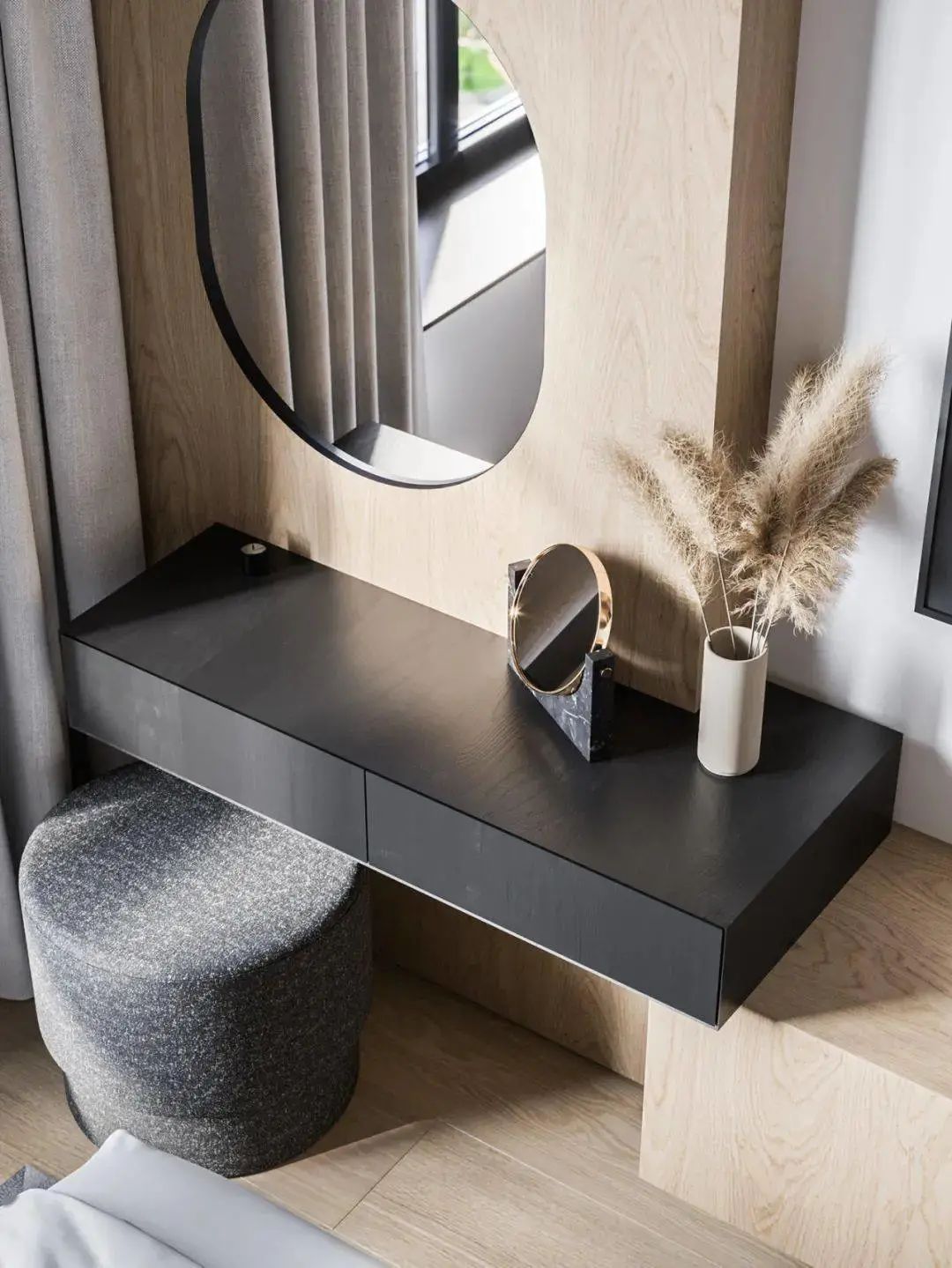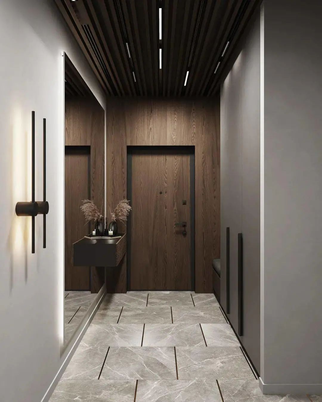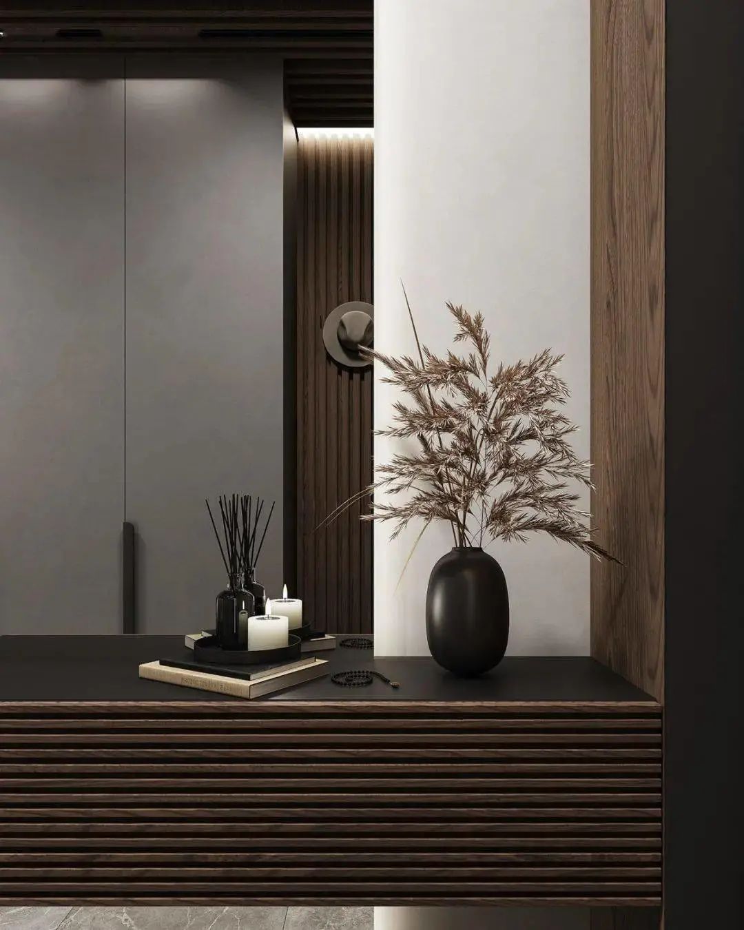 深色调的玄关,镜子的陈设让视觉更加丰富多变,清新怡人香薰、蜡烛以及黑色的陶瓷摆件,处处体现着精致。