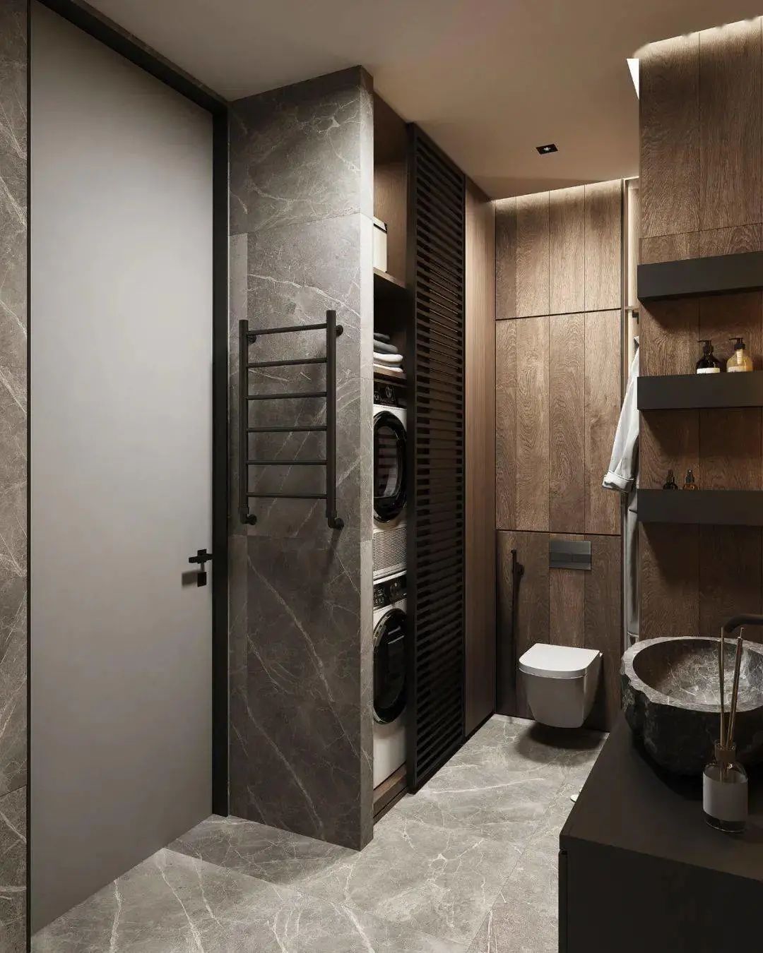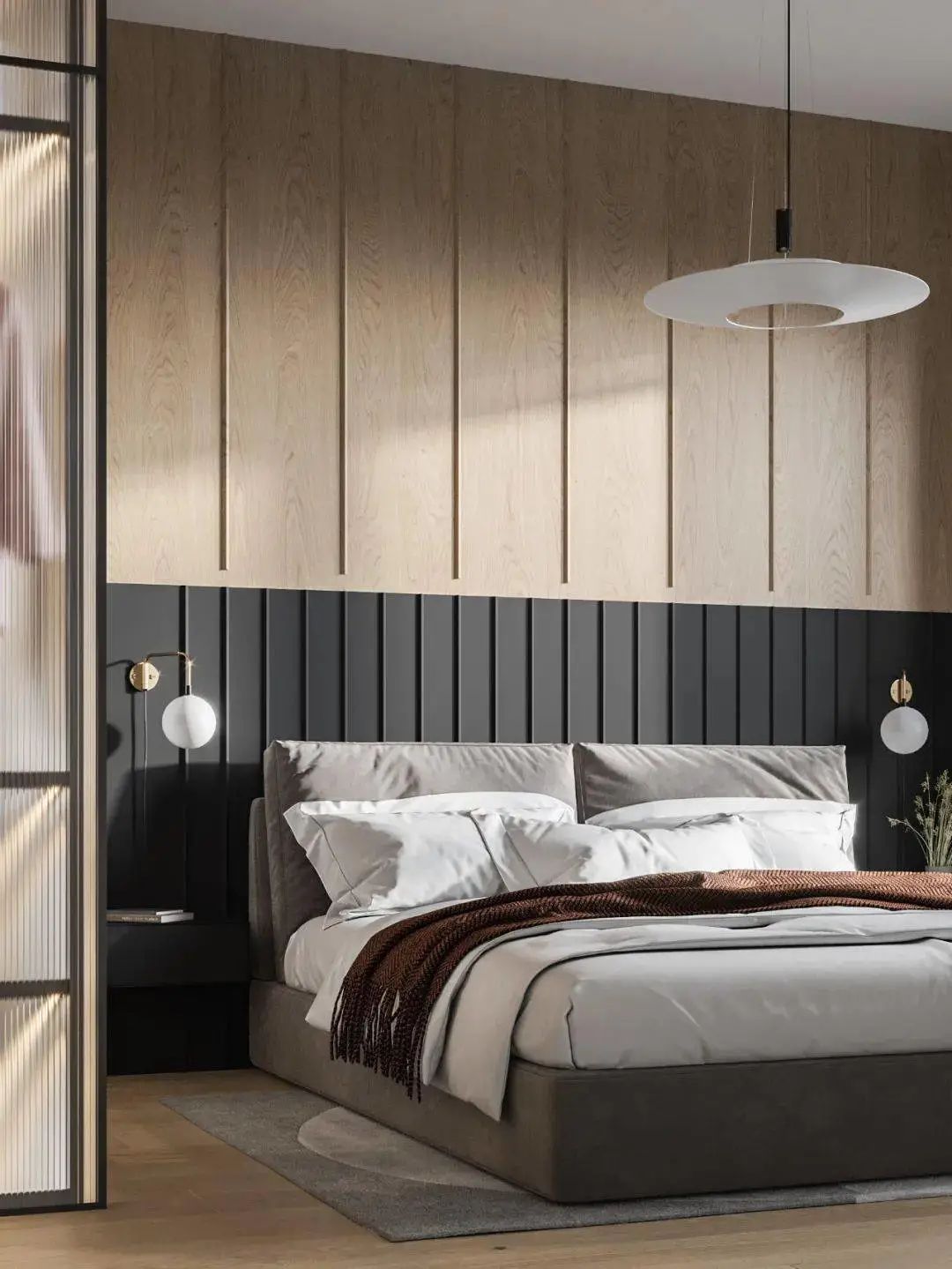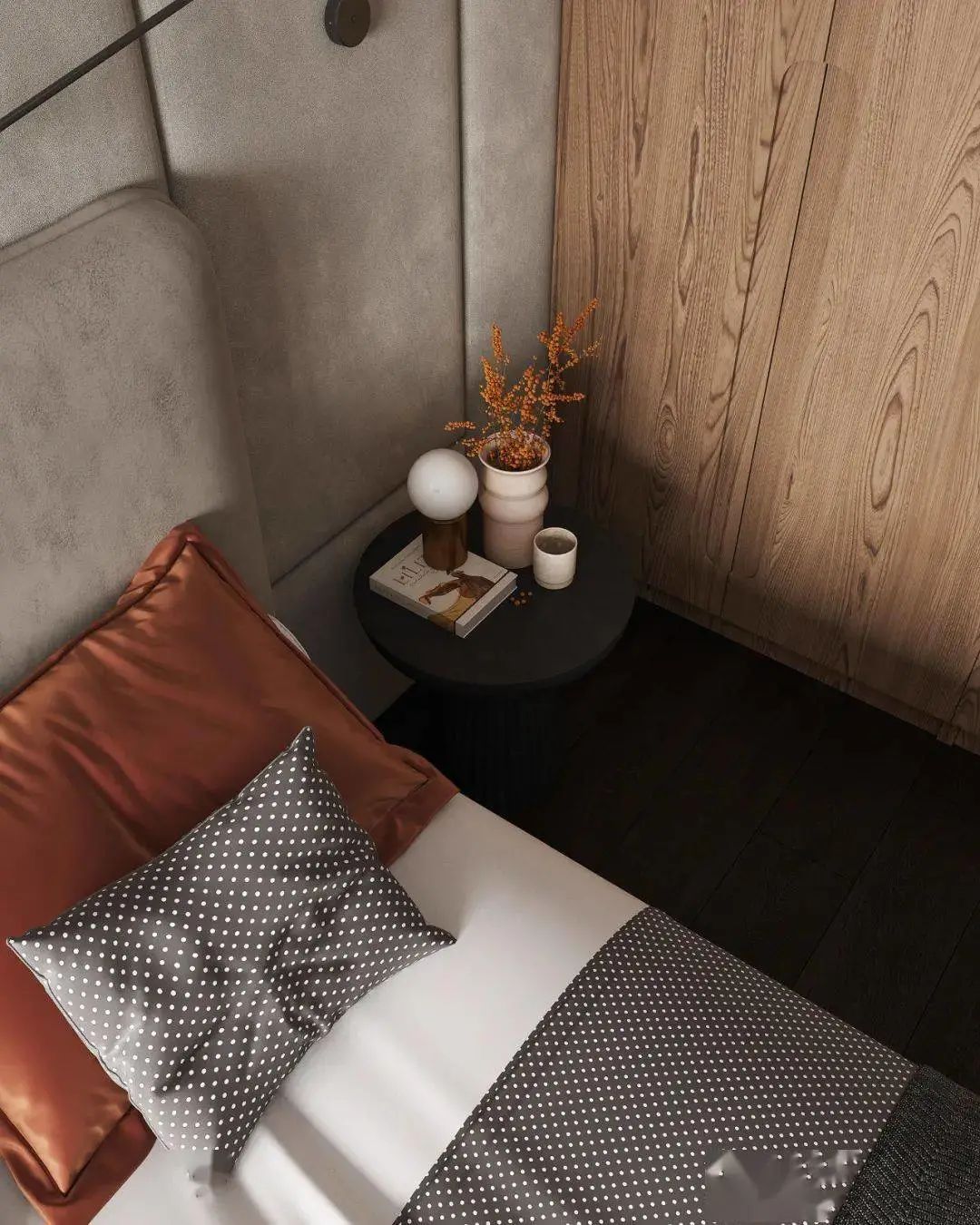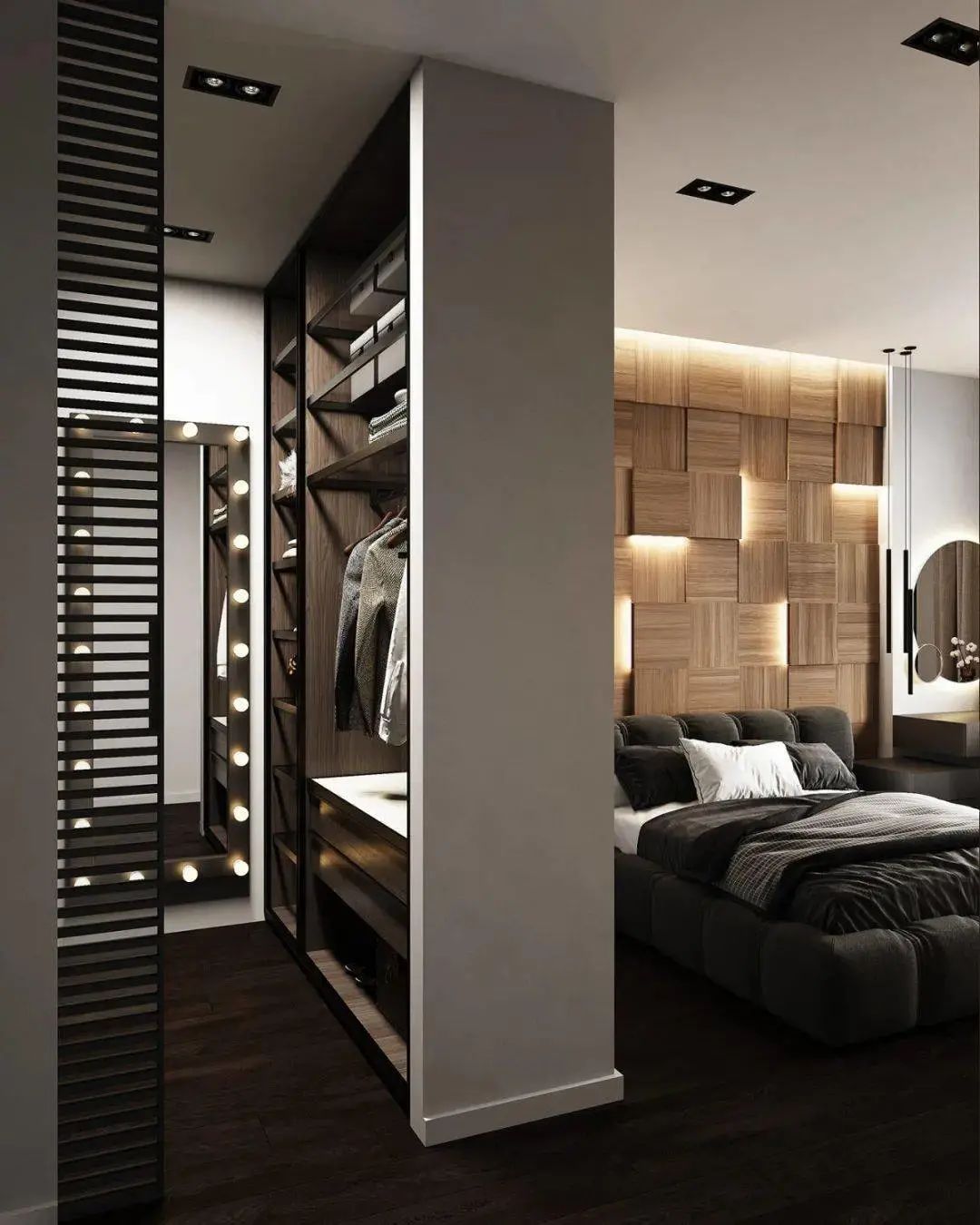 靠墙定制的通顶式衣帽柜,原木打底,同时注重光的运用,打造出冷暖兼具的空间,展现独特的生活美学。