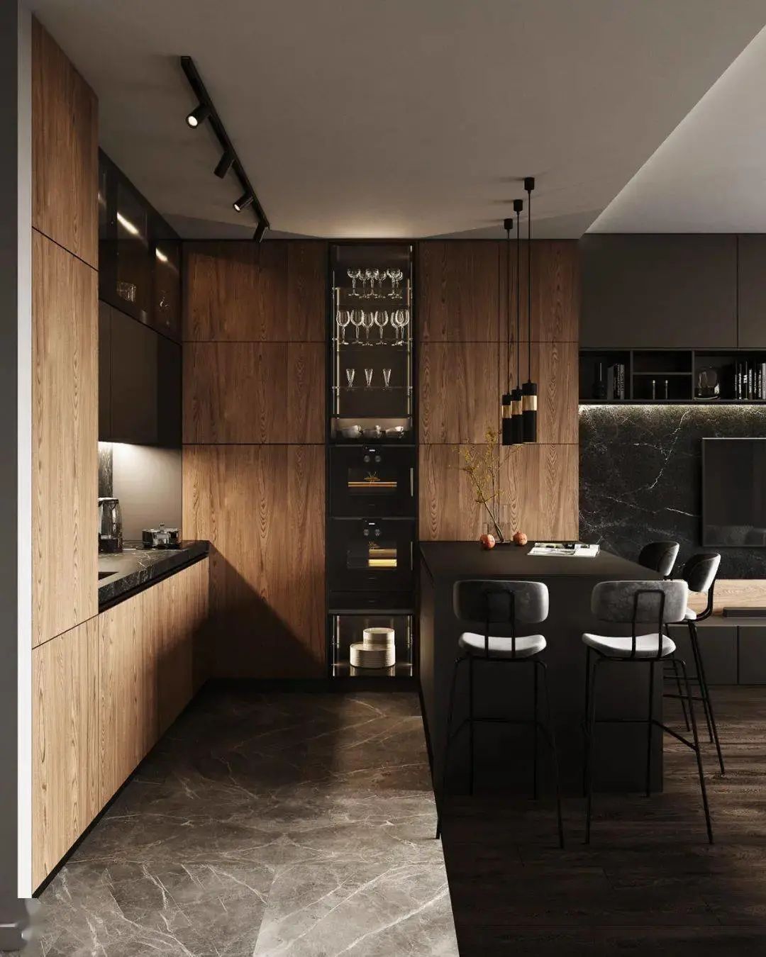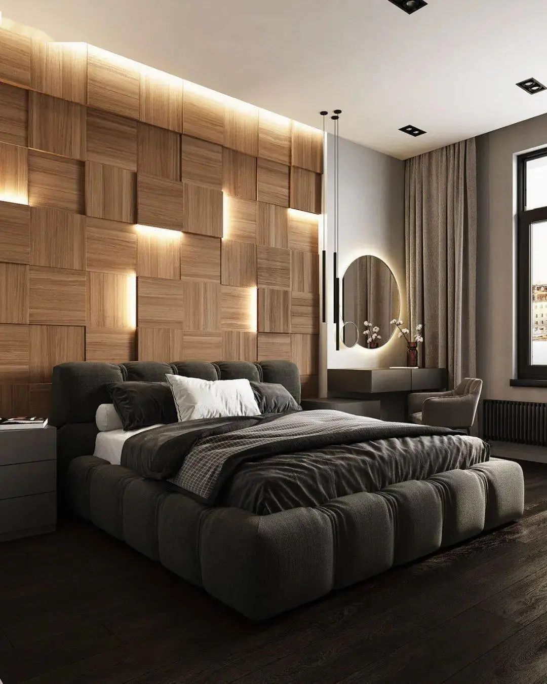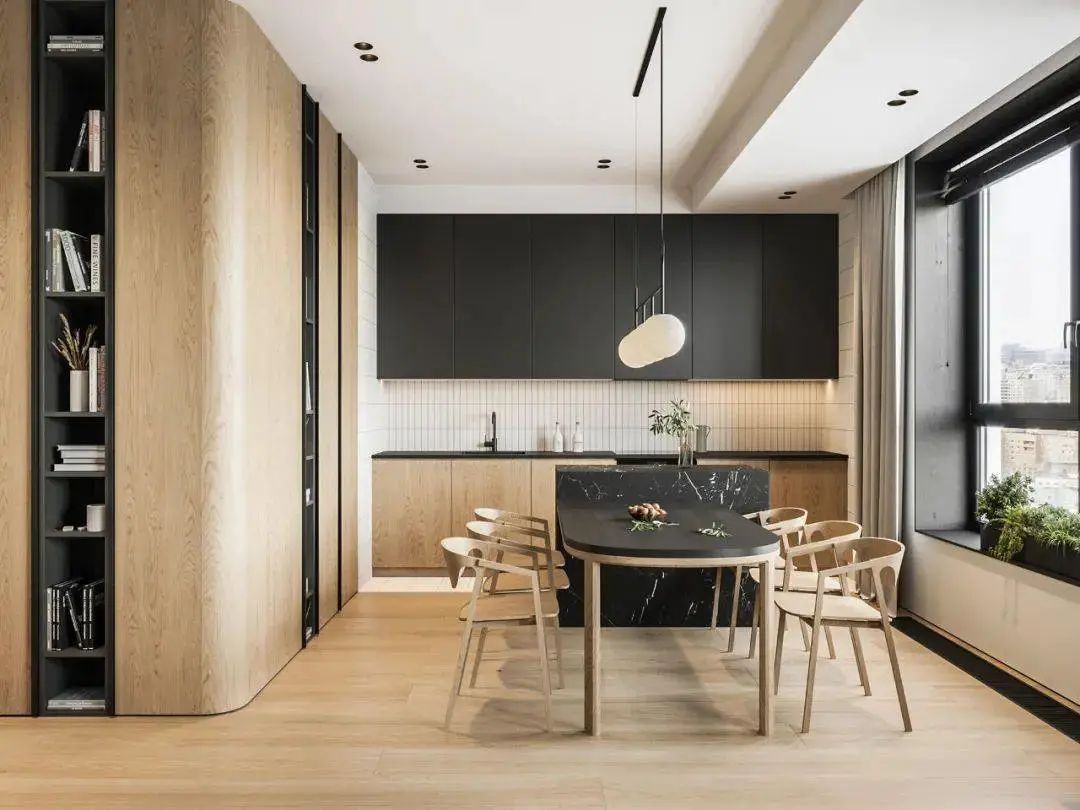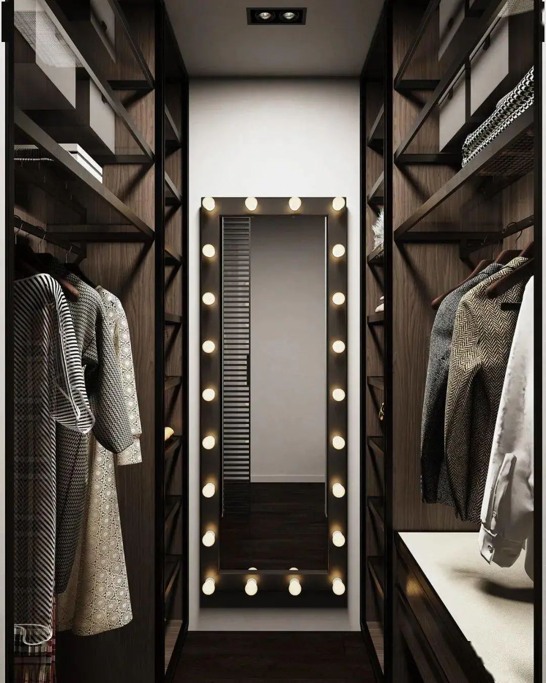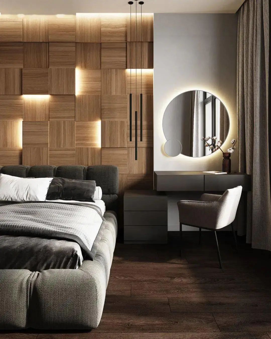 靠墙定制的通顶式衣帽柜,原木打底,同时注重光的运用,打造出冷暖兼具的空间,展现独特的生活美学。