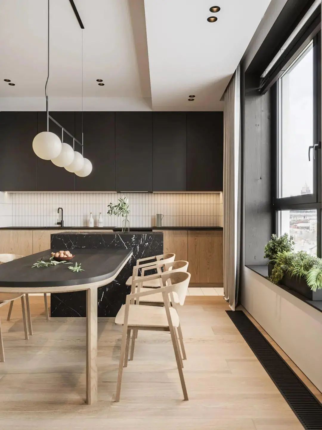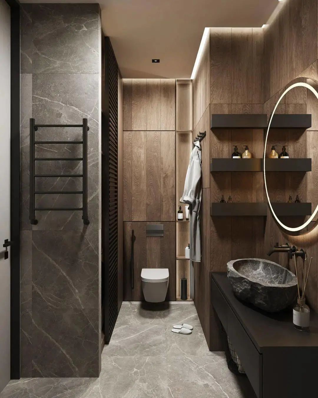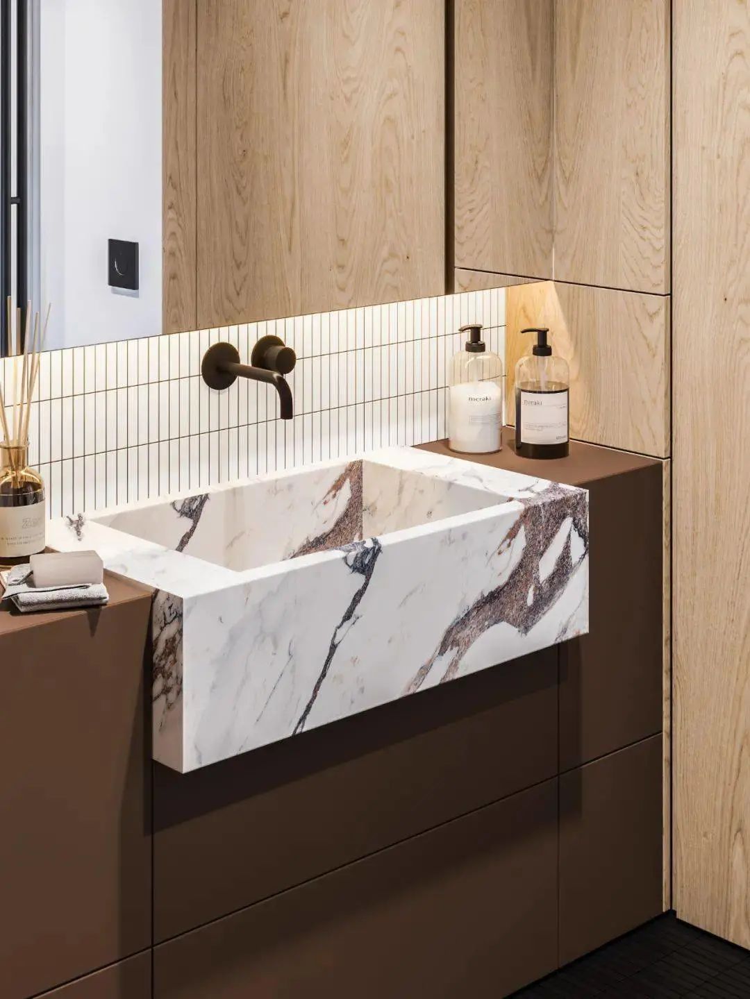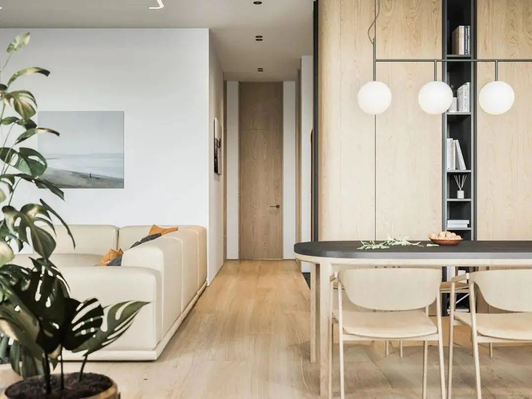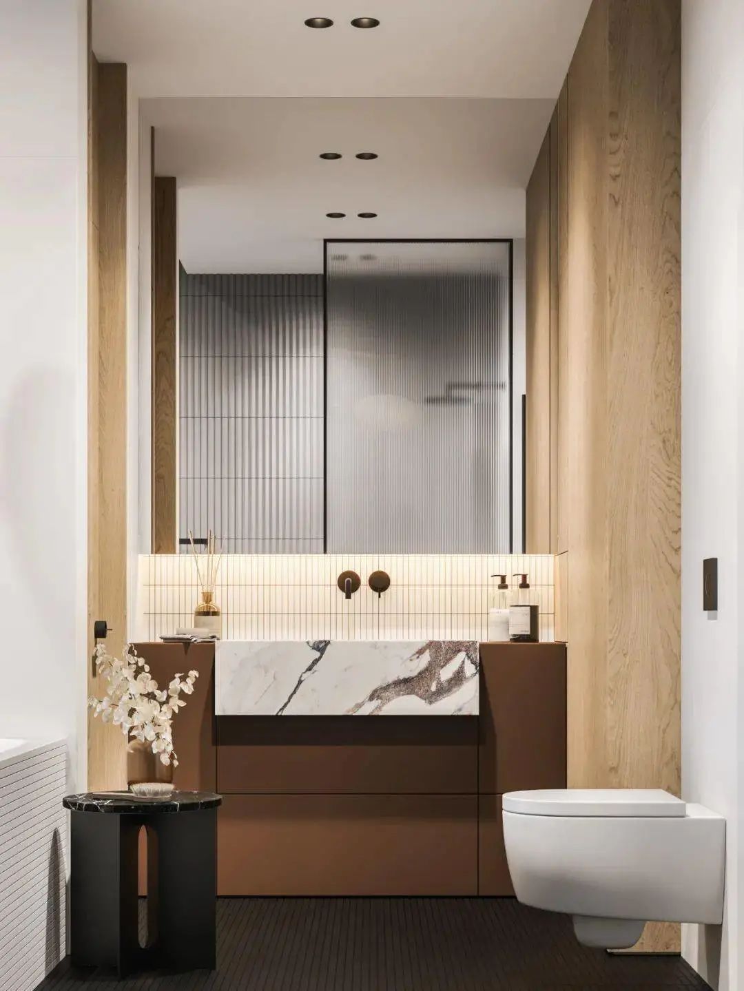 靠墙定制的通顶式衣帽柜,原木打底,同时注重光的运用,打造出冷暖兼具的空间,展现独特的生活美学。