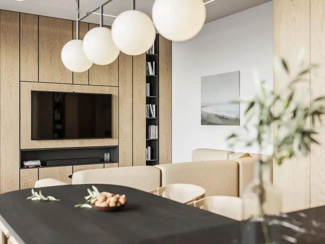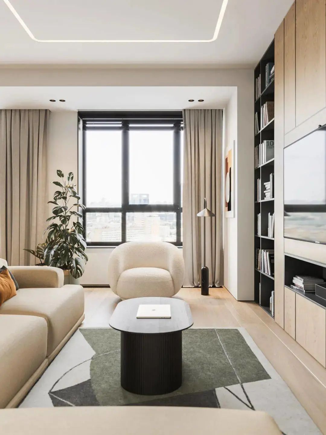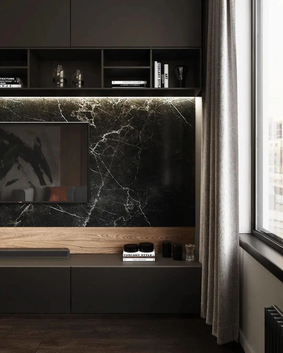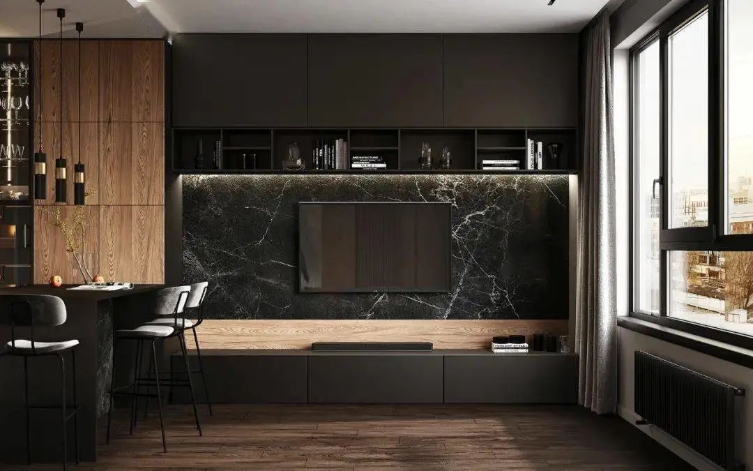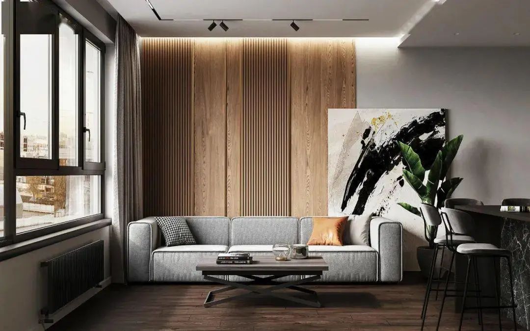 客厅的整体布置简洁舒适,浅灰色的布艺沙发搭配木格栅以及黑色大理石电视背景墙。