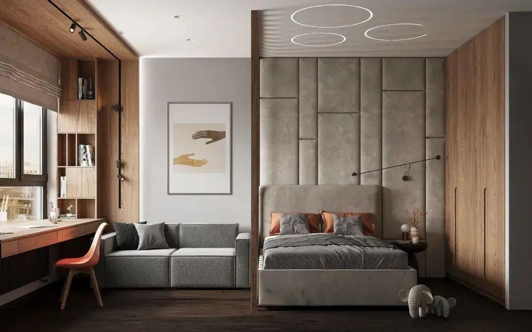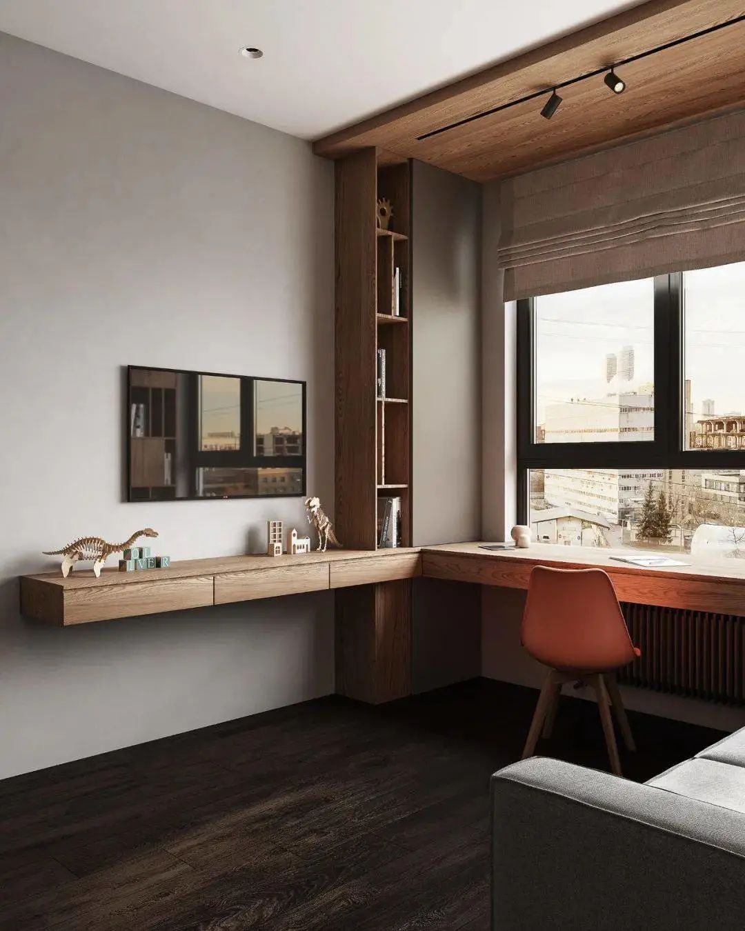 次卧在高级灰调中加入天然木质的元素,静谧舒适的感觉,巧妙利用窗台的位置改造为书桌,延伸过来是简约的电视柜,一气呵成,呈现定制家居实用性的优势。