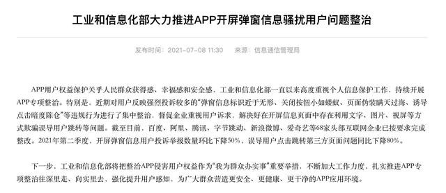 结果显然不是的,是工信部出手了!近日,由于用户对APP的“弹窗信息标识近于无形、关闭按钮小如蝼蚁、页面伪装瞒天过海、诱导点击暗度陈仓”等问题反映强烈投诉较多,工信部对主流APP进行了集中整改。
