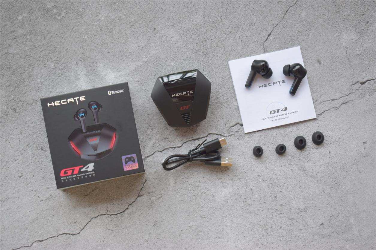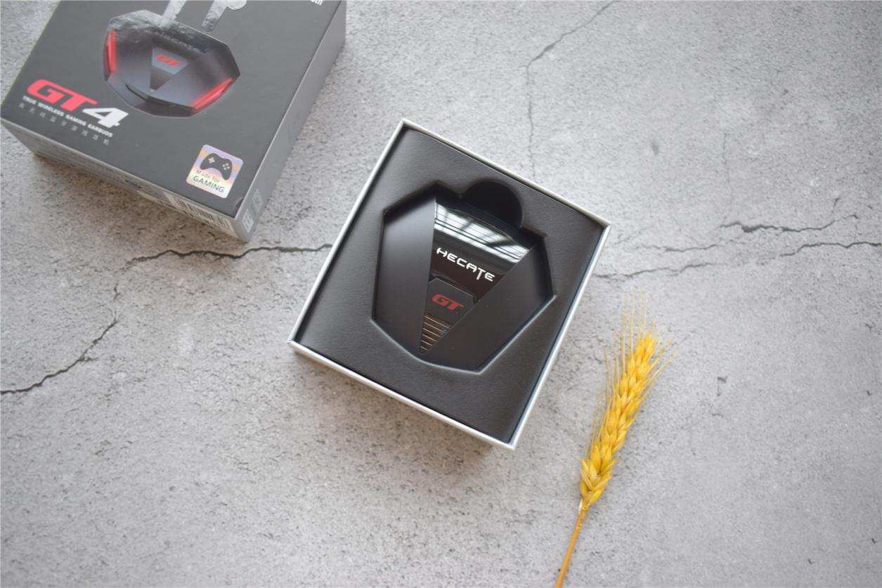 HECATE漫步者电竞,是漫步者旗下专业电竞音频外设品牌。这款GT4低延时蓝牙游戏耳机就是他们电竞级45ms低延时的主打产品之一,耳机外包装简洁、大气,采用天地盖式包装,除耳机本体,配件包括充电仓、三副不同尺寸的硅胶耳套、充电线和说明书,自用或送人都是不错的选择,美中不足是没有配送收纳袋,希望迭代时能为耳机配备专门的收纳袋。