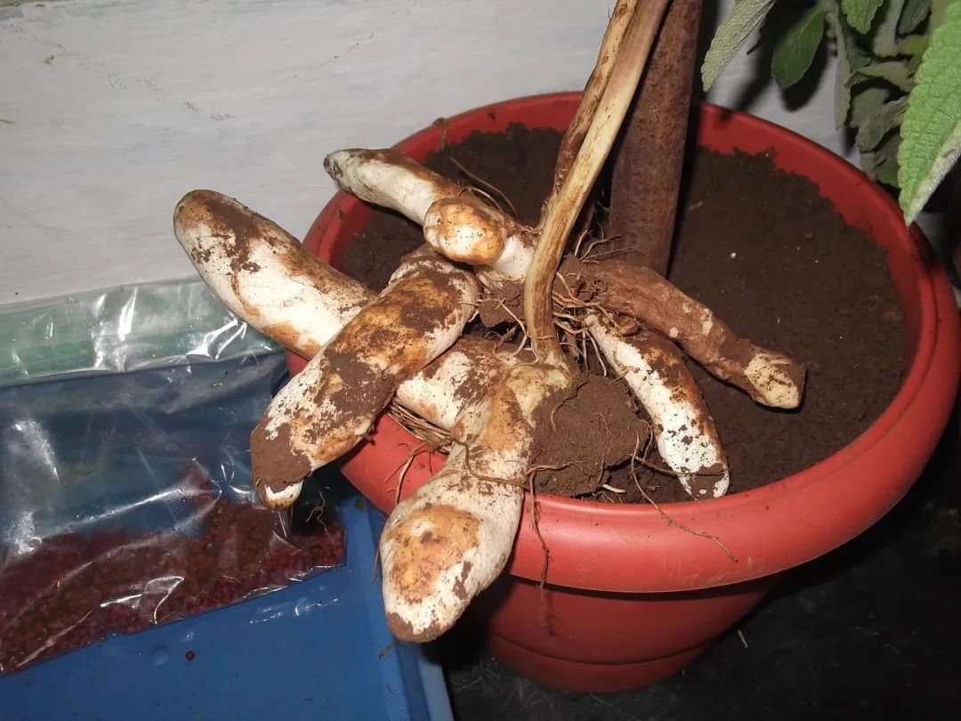 块茎挖起来后就可以用一些带一点潮气的泥炭土,或者是木屑将它掩埋起来,来年2月份之后再重新再种(18度以上)。