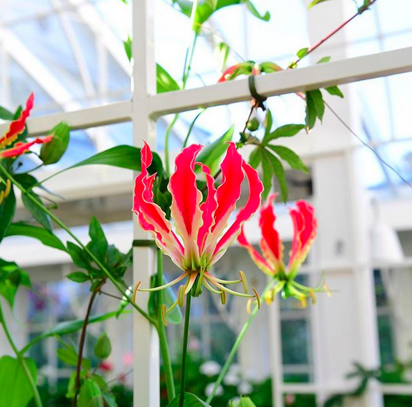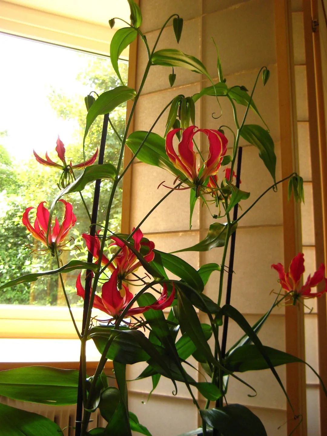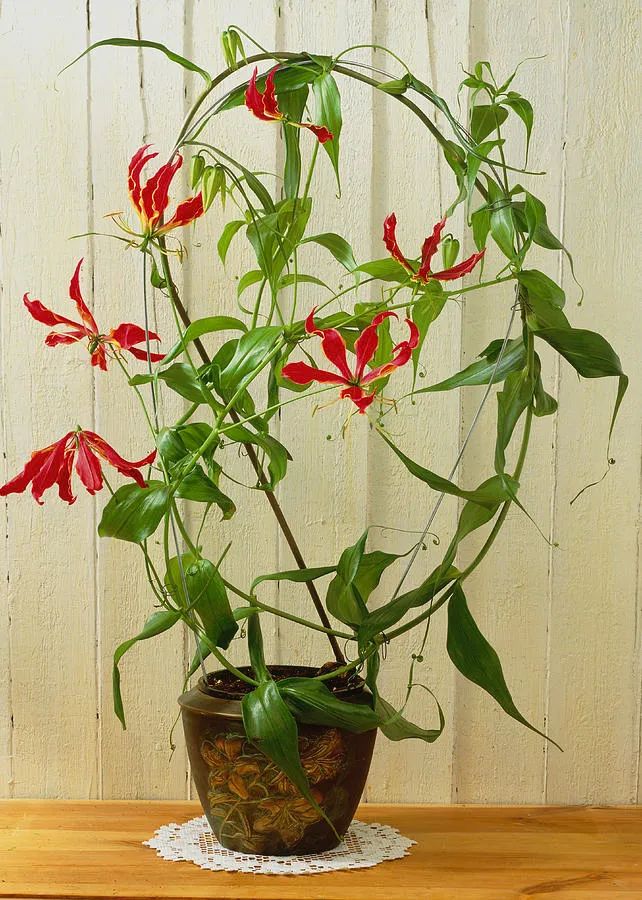 嘉兰百合并不是属于百合科的植物,而是属于秋水仙科嘉兰属的一种球根植物,它可以依附在其他的植物上爬藤生长(叶子末端会长牵引藤),在自然界它就是爬在其他树向上生长的,如果养在院子或阳台上,就要预先给它搭设好花架,适当牵引它的枝条。
