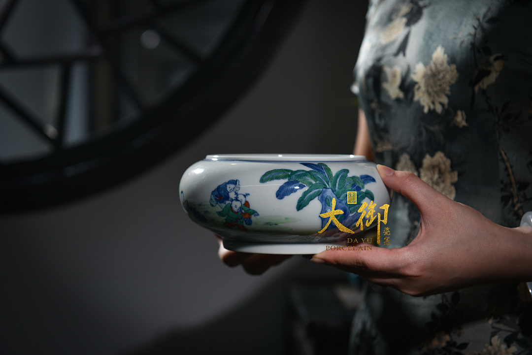 并在青花线条上传承了老一辈的所用的铁线描法,在青花“分水”技法中结合了国画泼墨手法,画面显得更加随性灵动,下笔工整细腻,人物画像栩栩如生,山水花鸟都达到了极佳的境界,作品层次分明。尤其是青花斗彩的结合,作品既有青花的雅韵又不失斗彩的鲜亮丰富,作品往往迸发异样的光彩!