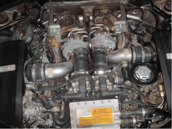 打开机盖,我们可以看到发动机表面无明显的油液渗漏。发动机线束和防火墙等处也没有水泡、火烧的痕迹。这款4.0版的飞驰采用了奥迪RS系列同款的4.0升双涡轮增压发动机,其技术特点就是将排气和涡轮系统中置,使得发动机结构更加紧凑,也提高了发动机的进气效率。匹配一台8档手自一体变速箱,最大马力来到了507匹,虽然与6.0T W型12缸的版本相比有所差距,但也称得上动力充沛了。