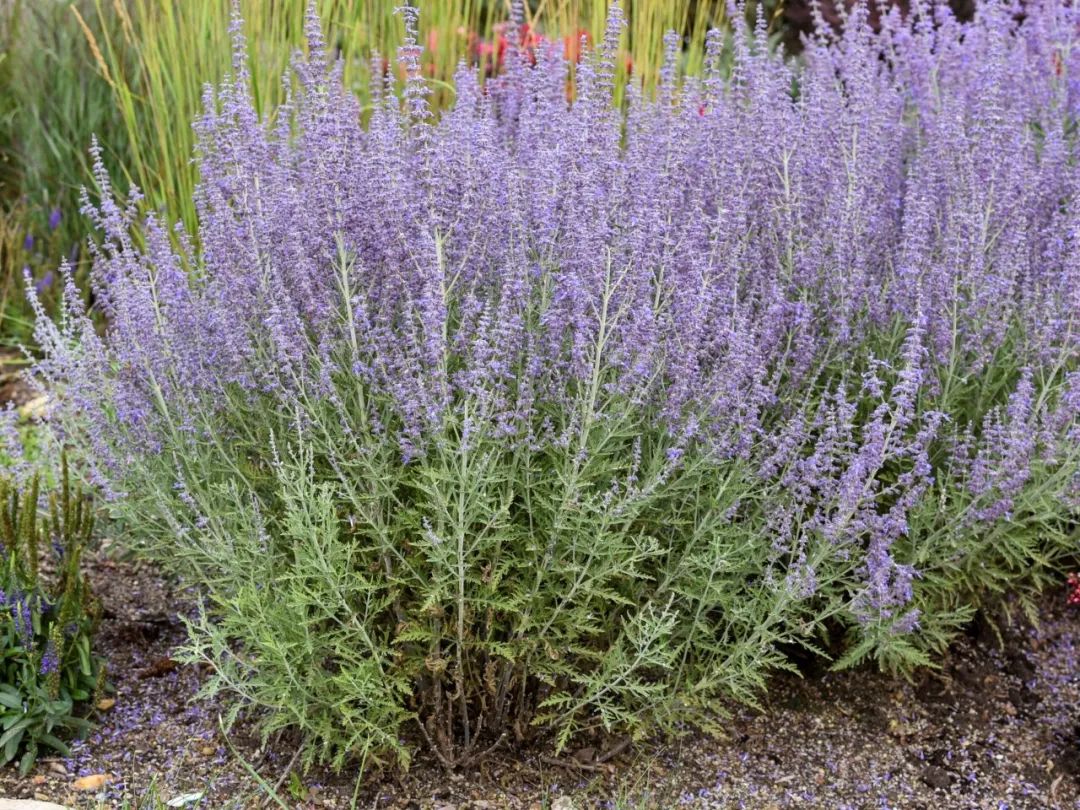 有人会叫它俄罗斯鼠尾草,一般是叫它“滨藜叶分药花”,它适合栽种在院子里光照充足的位置,它对水分需求比较少,可以长到80~90厘米高,比较适合种在花坛的中央。它的花穗可以开得很高,植株之间会长得非常紧凑,花色是呈淡紫色的,就和薰衣草的花色一样。