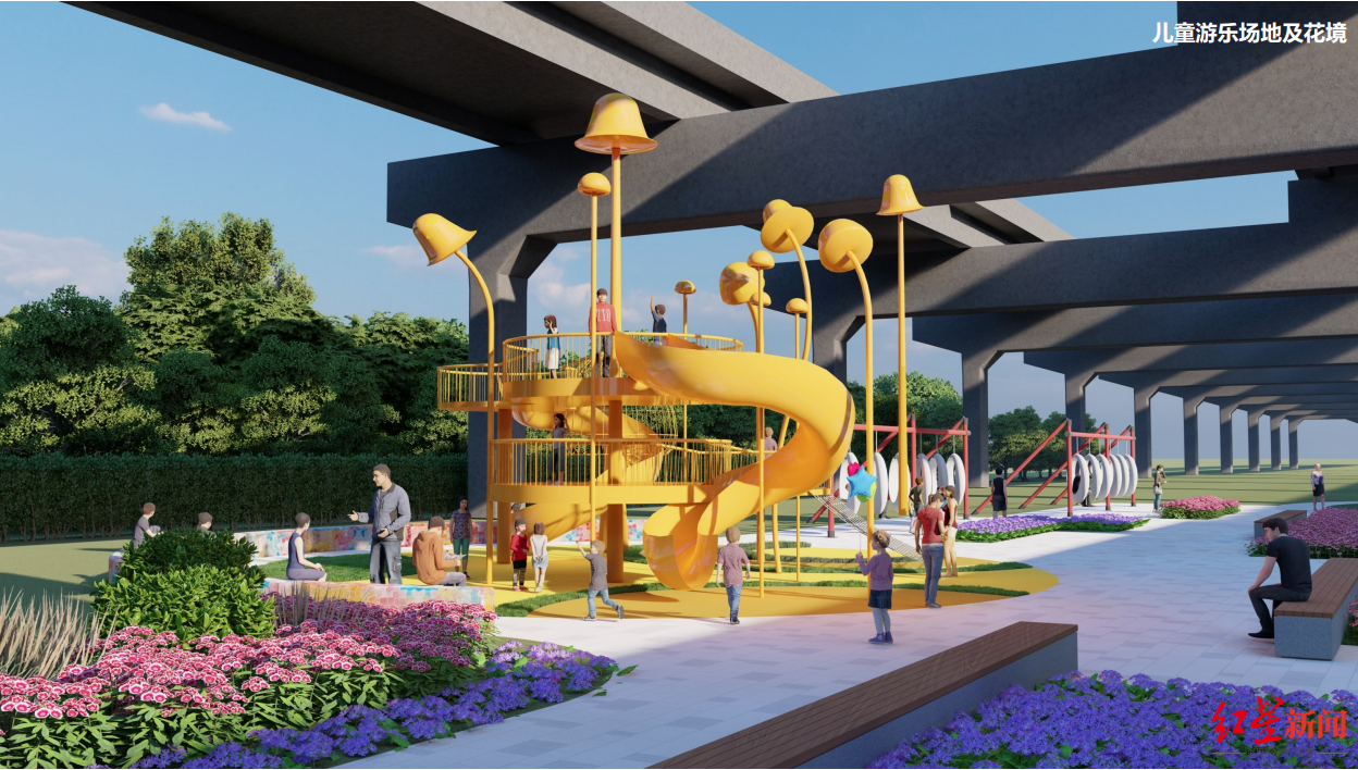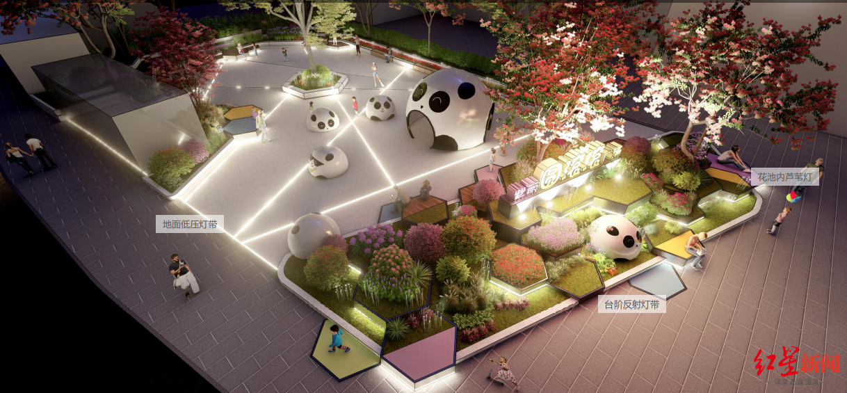 红星新闻记者从设计方案中看到,紫薇东路游园绿地的改造设计结合紫薇、色彩、熊猫三种文化,紫薇取其碎落的花瓣的组合方式,并在上面点缀多彩的颜色形成调色板,体现童趣色彩。转来转去的熊猫小屋以及专门设计的熊猫家族表情包,为广场赋予了生命力和互动性。