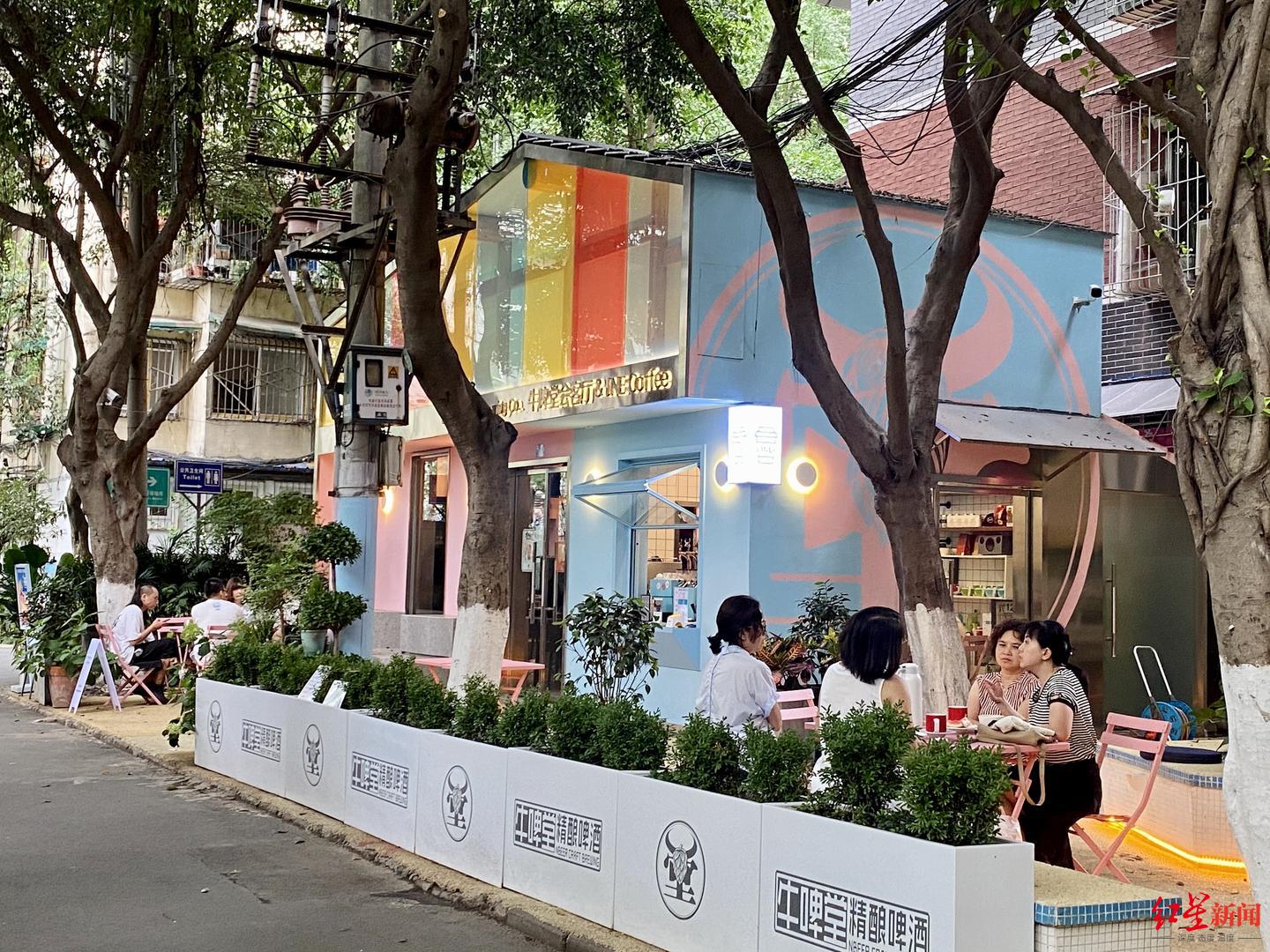 “我们通过引进企业入驻,以企业设计改造的方式,打造优雅时尚的消费新场景。”据成都市高新区芳草街道城管执法中队队长谢翔介绍,在不改变原建筑结构的情况下,入驻企业将此地改建成为一座咖啡屋,门前变成一处具有小资情调的广场,建筑添加了川西民居式屋顶,与周围环境相融,成为了供居民们活动的“会客厅”。