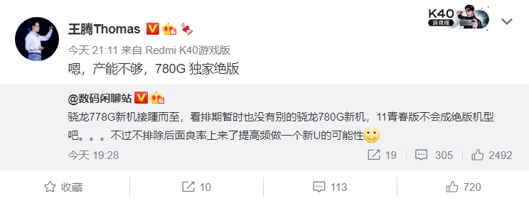 微博博主 @数码闲聊站 称,骁龙 778G 新机接踵而至,看排期暂时也没有别的骁龙 780G 新机,小米 11 青春版不会成绝版机型吧。不过不排除后面良率上来会提高频做新 U。而小米公司 Redmi 产品总监王腾回应称,产能不够,骁龙 780G 是独家绝版。