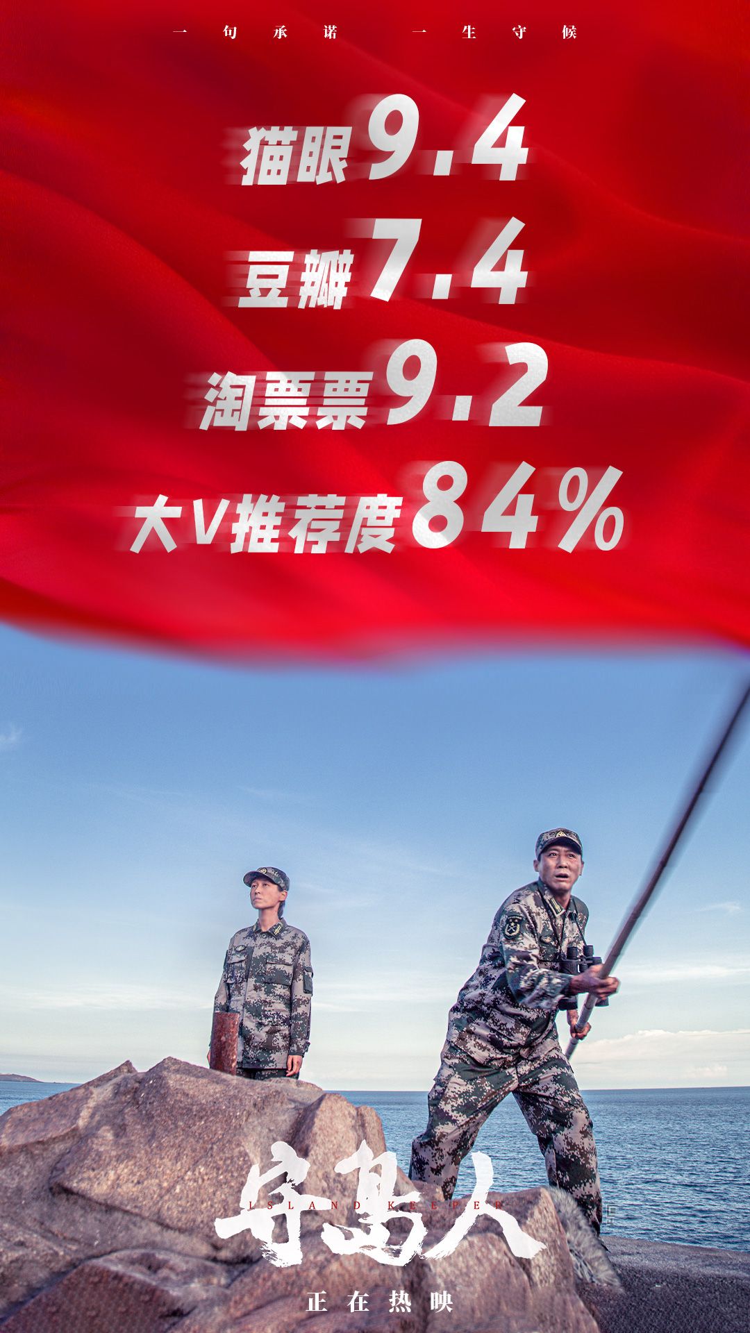 在电影《守岛人》当中,没有夺人眼球的噱头,也没有炫酷的动作戏,整部电影聚焦一对夫妻,三只忠犬和风吹雨打的小岛。影片以朴素平实的笔触,选取了夫妇二人守岛生涯的经典片段和闪光瞬间,让观众们从侧面感受到了王继才夫妇丰富的内心世界和家国情怀。无论在社交平台,还是在电影网站,《守岛人》的页面里都写满了真情实感的评价,观众们不吝赞美,纷纷打出高分,截止目前,影片在猫眼平台9.4分,淘票票平台9.2分,豆瓣评分也稳定在7.4分。