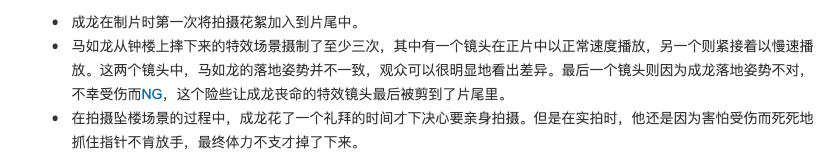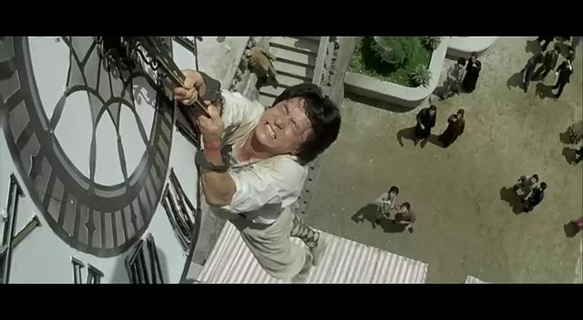 这部电影里有个镜头是成龙饰演的马如龙从钟楼上直接摔下来的场景,在正片中我们看到的镜头是这样的——