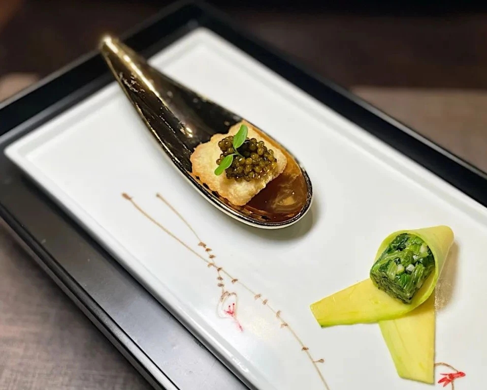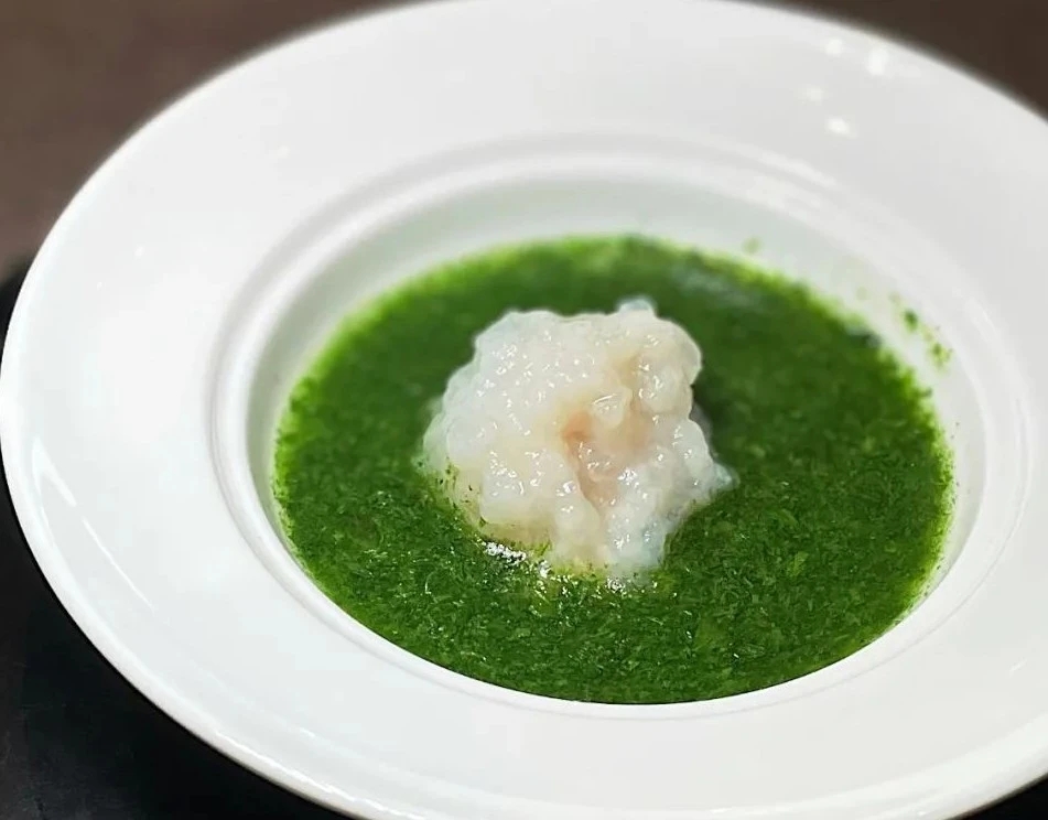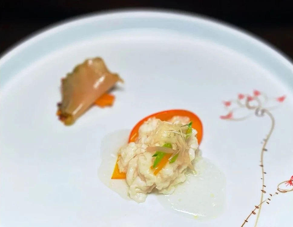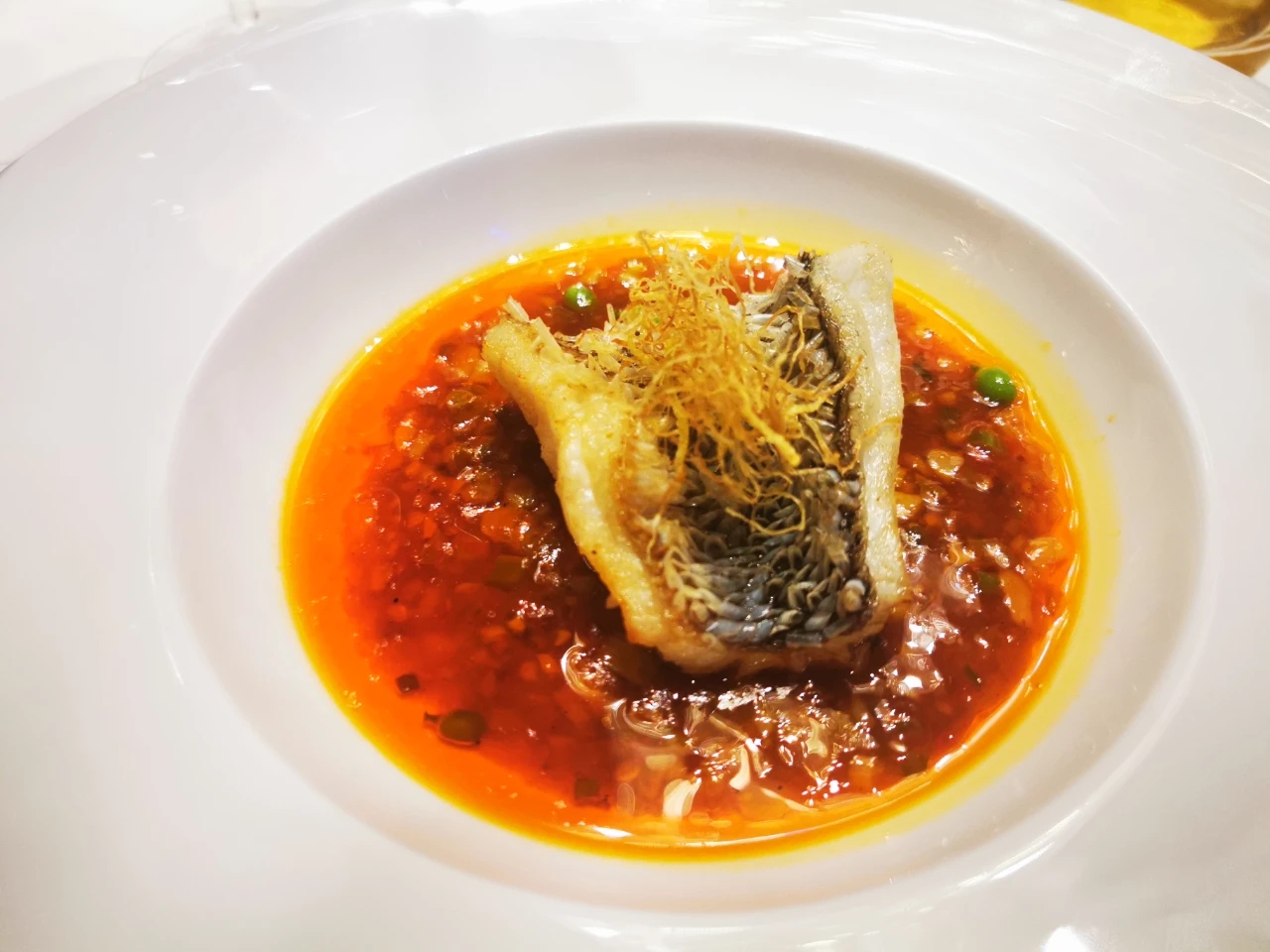 汤品是咸鲜味的清汤仔鸡豆花,“唱戏的腔,川菜的汤”,川菜中的清汤,经历鸡汤慢炖、吊汤、扫汤三道步骤,是咸鲜味型的代表。鸡豆花是鸡胸肉剁成茸后与蛋清合体形成的嫩似豆花的蛋白团,吃鸡不见鸡,彷若浮云飘在清汤之中,这是中国版的分子料理;主菜共两道,青辣味的青辣汁翘壳鱼,以大量绿色二荆条辣椒、新鲜青花椒、藤椒油,混合出不同层次的辛香,交织成清新的麻与辣,绿得层层叠叠。大型野生翘壳鱼,也叫翘嘴鱼、白鱼,肉质细腻,脂如白玉,以奇香沁人的青辣味烹之,回味甘鲜,气势十足;随之而来的清口菜鱼子酱鲜笋甜虾,又让口腔清润了一番,为下一轮菜做好了铺垫。