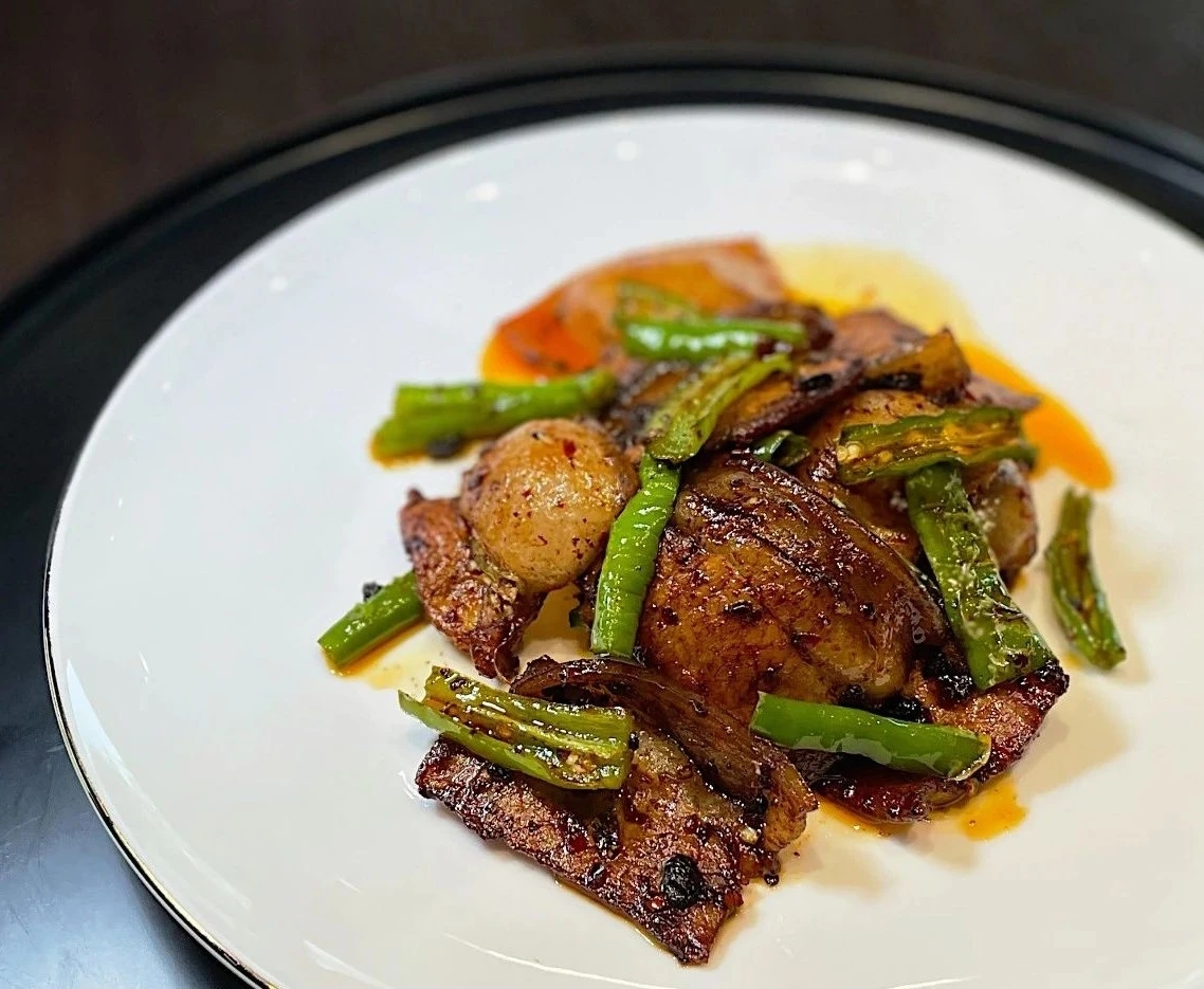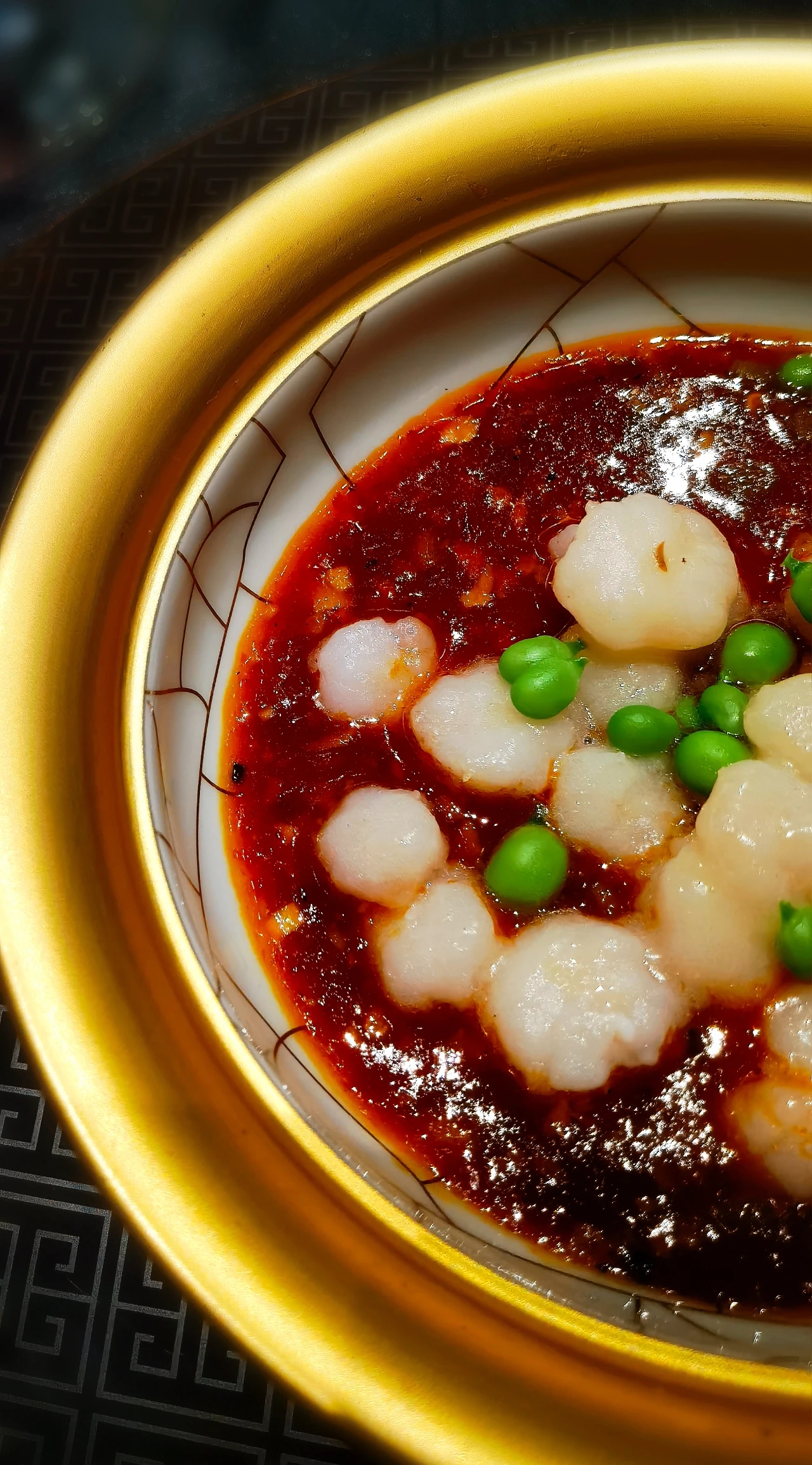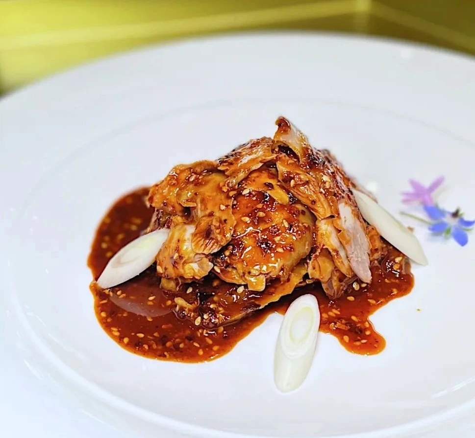汤品是咸鲜味的清汤仔鸡豆花,“唱戏的腔,川菜的汤”,川菜中的清汤,经历鸡汤慢炖、吊汤、扫汤三道步骤,是咸鲜味型的代表。鸡豆花是鸡胸肉剁成茸后与蛋清合体形成的嫩似豆花的蛋白团,吃鸡不见鸡,彷若浮云飘在清汤之中,这是中国版的分子料理;主菜共两道,青辣味的青辣汁翘壳鱼,以大量绿色二荆条辣椒、新鲜青花椒、藤椒油,混合出不同层次的辛香,交织成清新的麻与辣,绿得层层叠叠。大型野生翘壳鱼,也叫翘嘴鱼、白鱼,肉质细腻,脂如白玉,以奇香沁人的青辣味烹之,回味甘鲜,气势十足;随之而来的清口菜鱼子酱鲜笋甜虾,又让口腔清润了一番,为下一轮菜做好了铺垫。