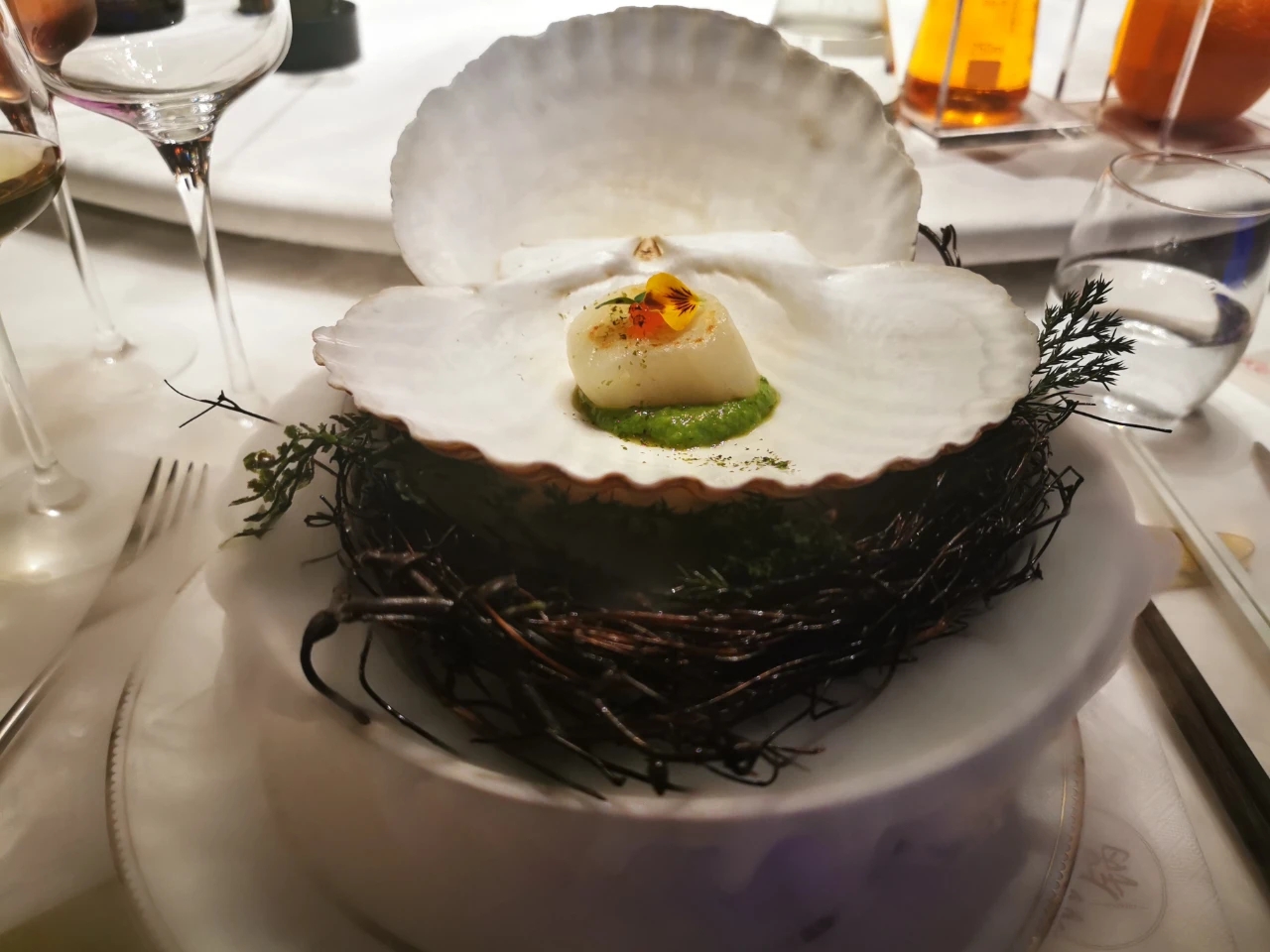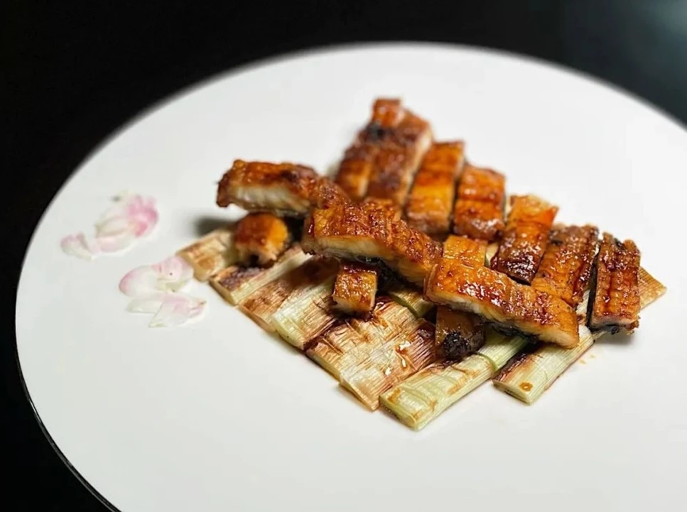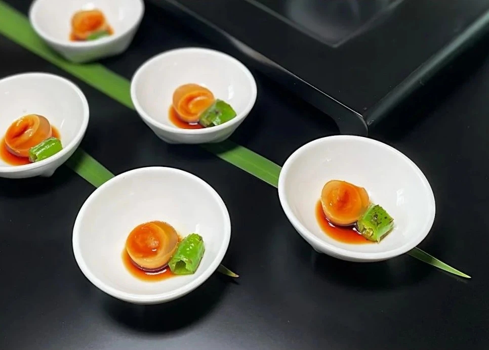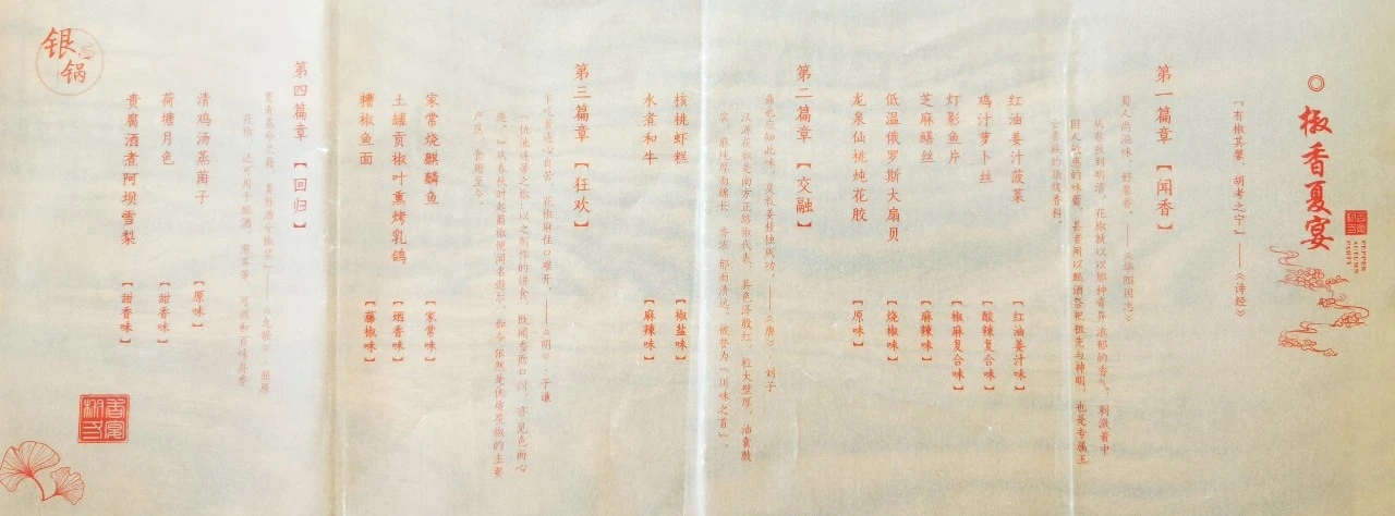 第一篇“闻香”香,主题是突出嗅觉感知花椒之香,共六道菜:红油姜汁味的红油姜汁菠菜、酸辣复合味的鸡汁萝卜丝、椒麻复合味的灯影鱼片、麻辣味的芝麻鳝丝、烧椒味的低温俄罗斯大扇贝、原味的龙泉仙桃炖花胶;第二篇“交融”,突出触觉感知花椒之麻,让花椒之香与食材深度融合:椒盐味的核桃虾糕,核桃的香和虾糕的鲜,与椒盐和麻香简直就是放大效应。用海南和牛做的麻辣味水煮和牛,加了两滴花椒精油,反而减少了辣却增加了香;第三篇“狂欢”,将麻香推向高潮:家常味的家常烧麒麟鱼,选取夏季当季鲈鱼,用日本立鳞烧的做法,鱼肉鲜嫩、鱼鳞酥脆。烟香味的土罐贡椒叶熏烤乳鸽,将花椒的香味通过烟熏入味。藤椒味的糟椒鱼面,以鱼肉成面,川菜的精致,尽显本色;第四篇“回归”,味道回到清雅,原味的清鸡汤蒸鸡枞菌、甜香味的荷塘月色,选用当季食材,这两道川菜,淡雅得很。最后是甜品,甜香味的贵腐酒煮阿坝雪梨,将跳舞的舌尖回归平静。这顿椒香夏宴,以花椒为主题,食材来自五湖四海,做法、盛器别出心裁,把花椒之美演绎出另一种风情。