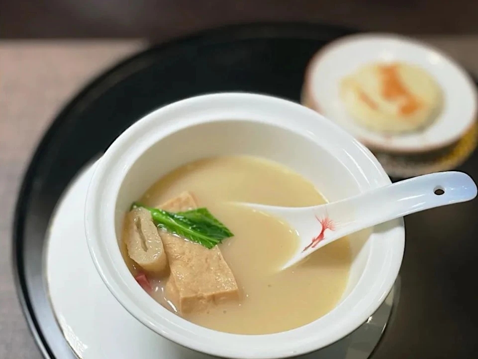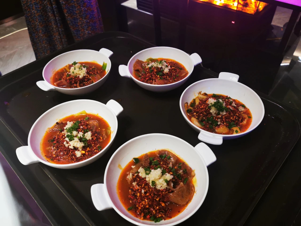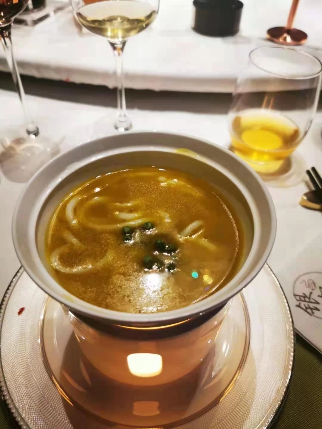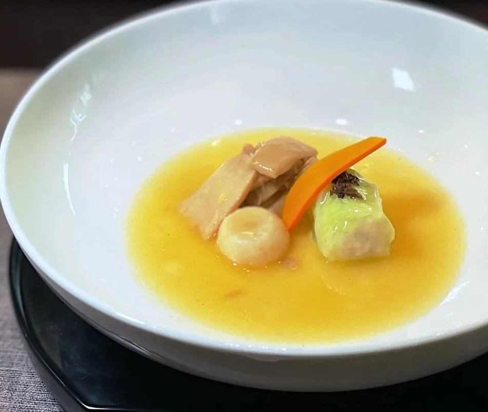 川菜以清鲜见长,以麻辣著称,那种只见麻辣不见清鲜,是丢了川菜的本源,“有云”的蓝派川菜,为川菜正本清源。这席包席宴,以蜜饯、水果、干果、糕点做为开席盘,大家喝茶聊天吃点心,重现了晚清宴席的标配;人齐入席,先来一个糖碗,一人一小碗老鸭海参粥,这算给胃垫底,等一会儿喝酒,胃里有点东西,不难受;十二道凉菜,怪味鸡片、蒜泥白肉、椒麻鹅片、葱酥鳗鱼、糖醋排骨、陈皮兔丁、舍不得拼鱼子酱、酸菜呛蕌头、姜汁豇豆、烧椒非遗小皮蛋、美味香菇、酸辣凉面,有辣有酸、有咸有甜,只要每一道都尝一口,基础上就吃饱了,只能感叹古人真能吃;头汤是口袋豆腐,展现的是川菜的奶汤。川菜的奶汤,用鸡、鸭、猪肘、肚、蹄等旺火熬制,中途不闪火,不加水,成品浓白如奶,香鲜浓厚,其原理是炖出肉和骨头中的脂肪和蛋白质,脂肪与水不相溶,一般情况下会形成一层黄色的油浮在上面,但有了蛋白质,蛋白质里的疏水氨基酸抓住脂肪,蛋白质里的亲水氨基酸抓住水,这样就形成了无数分散于汤水中的小油滴,光线一照射,反射出来就是奶白色。这道汤,用了酥肉和煎鸡蛋、煎豆腐熬制奶汤,脂肪、植物蛋白、动物蛋白都有了,奶白得仿佛可以下奶。