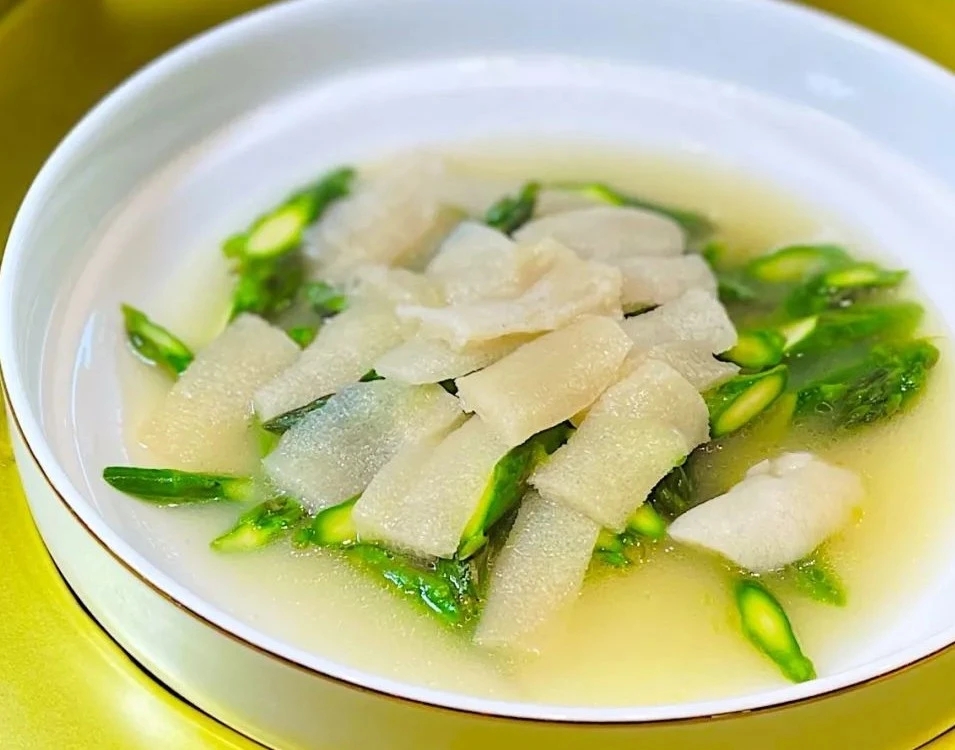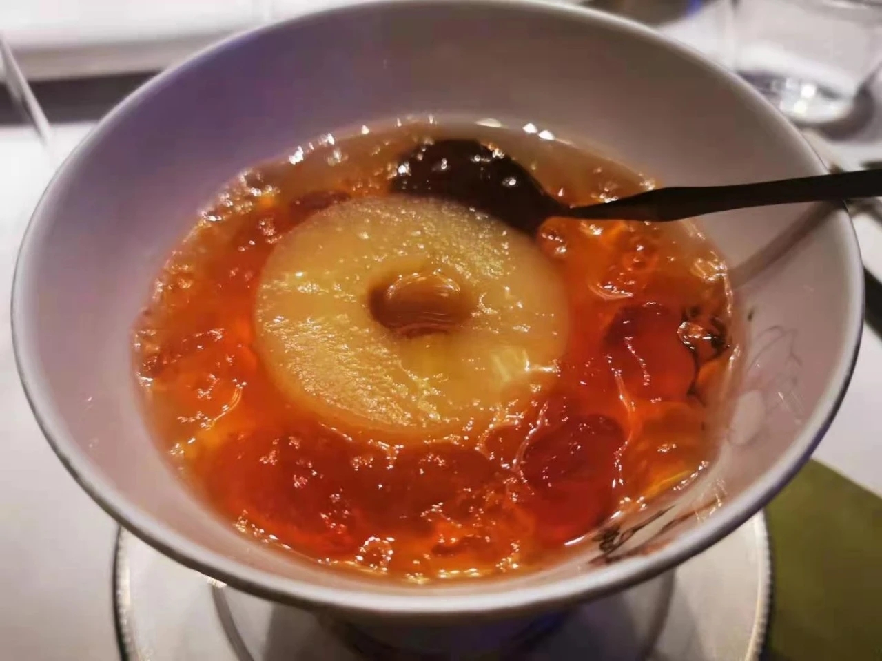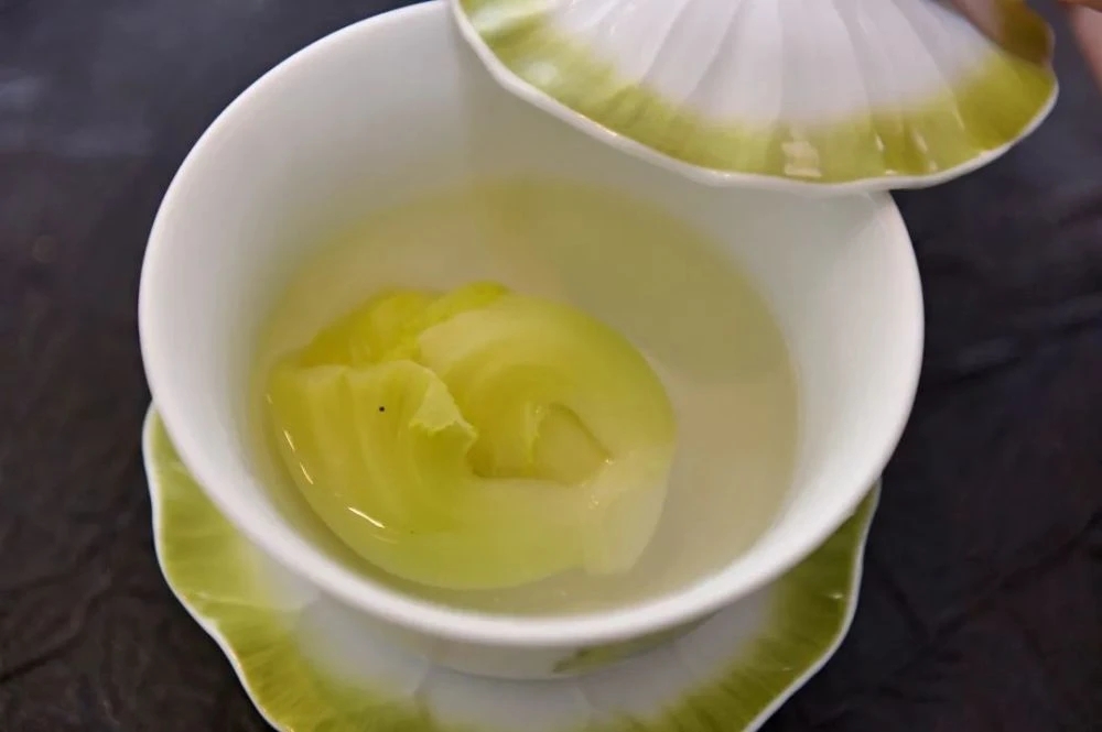 够丰富了吧?且慢,好戏还在后头。跟着上来的是两个中点,酸菜水饺和糖油果子,酸让人开胃,而人一旦见到甜,明明肚子已经装不下了,大脑还是会发出个信号:也许可以试一下。你忍不住把这两道菜又吃了。记住,这只是“中点”!马上上来的尾汤藏上冰泉一口汤,以帮你清清喉咙之名,行彻底把你吃撑之实。川菜的清汤,用鸡、鸭、排骨、火腿等和清水,先旺火去沫,再小火煨,用红茸子扫汤,成品清澈见底,味美清鲜。奶汤是想方设法把脂肪和蛋白质赶出来,所以用猛火加速搅拌,而清汤只取肉里呈鲜味的氨基酸,把脂肪和蛋白质赶走,所以用小火。红茸子扫汤,就是用脂肪最少的里脊肉或鸡胸肉剁成泥,放进汤里,肉泥遇热凝固,把汤里的脂肪和肉碎都吸附了,再把凝固的肉饼取走,汤里就只有氨基酸了,所以又清又鲜。这碗汤喝下去,菜和汤估计已经顶到了胸口,但是,还有两道随饭菜:回锅黑猪肉和热拌空心菜,所谓随饭菜,就是说就着米饭吃才香。好吧,你要是还能吃得下,我不仅扶墙,还服你!