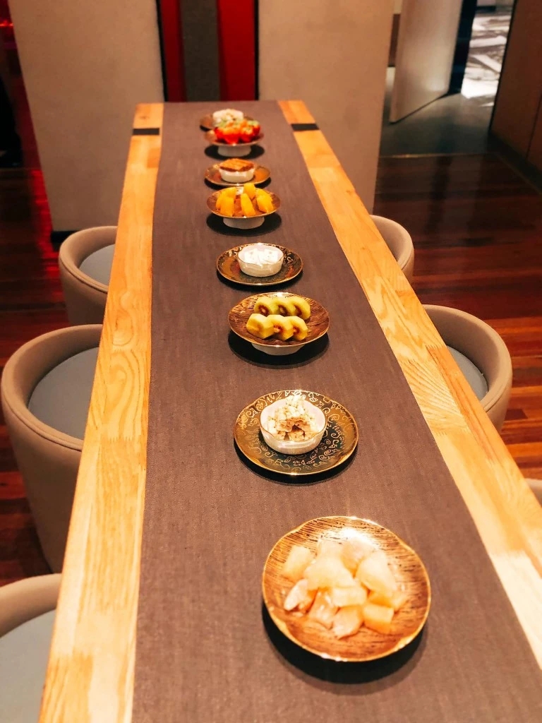 开餐前先奉茶,雅安蒙顶甘露绿茶,开宗明义“这里是四川”。一长条茶案上,摆上糖油果子、火腿蛋苕酥、合川桃片、黄老五花生酥作为四干果,时令水果拼盘作为四鲜果,一边吃小点一边喝茶师沏的三十年普洱,这个迎宾候客程式,豪华又亲切。