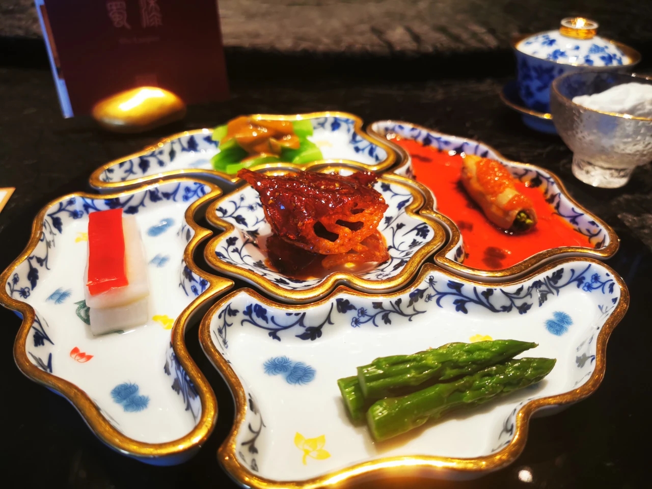 宴席开端,上来一蜀漆提盖,黑红主色,回首龙纹,灵感来自战国时期成都“商业街”出土的漆器纹。揭开来,五道凉菜:麻酱味的麻酱汁翡翠片、红油味的红油蒜泥腰卷、芥末味的芥末汁鲜芦笋、泡菜味的泡菜汁白玉脆、陈皮味的陈皮灯影牛肉,看似简单的凉菜做得就像一个小乐章,命名五福,既是五种口味,更是五个音符,这个前奏,内容丰富。