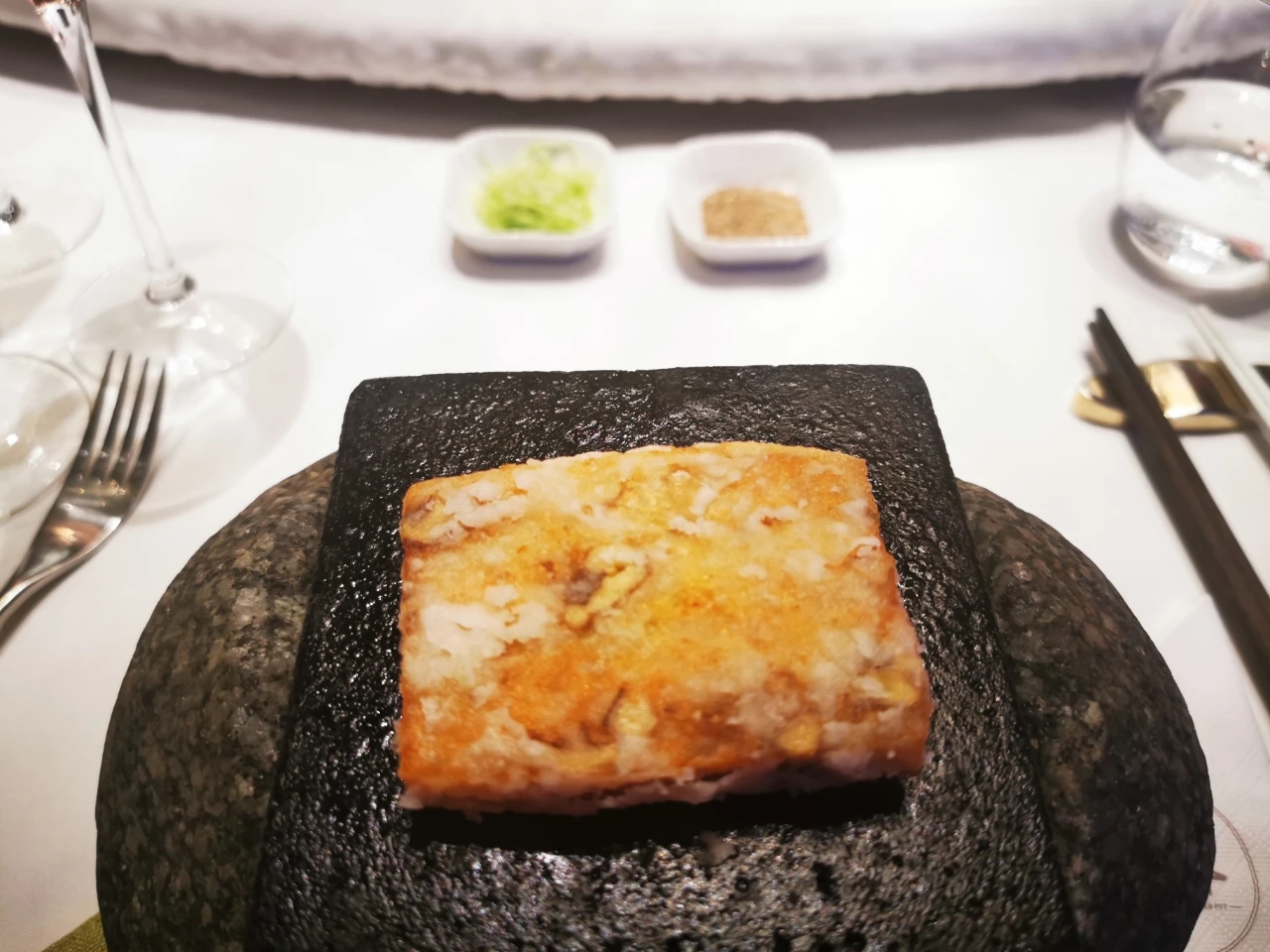紧跟上来的十一道“行菜”,一点也不含糊。椒盐、烟香味的糯米樟茶鸭脯,包含樟茶鸭和糯米鸭两种川式鸭菜,椒盐味和烟香味两种味型;酸辣味的酸辣面鱼子拼牛肉焦饼,手工刮出的面团子,型如鱼儿,筋道十足,用泡菜熬出酸辣汤来煮,热辣暖胃。椒麻味型的牛肉焦饼,以大红袍花椒香油、生菜籽油以及新鲜葱叶,拌入牛肉末作馅,饼身炸至圈圈焦酥香麻,鲜、香、麻辣;家常味的家常蜂巢松茸,以当季的松茸配以“家常味”这一最是家常下饭的味型,融合出柔和的咸鲜香辣;原味、淡甜味的冰镇九年百合,用极品的9年百合,肉厚味甜,冰镇后点上桂花蜜,味清心甜,遗憾的是生吃百合,百合里的淀粉未经加热糊化,人体无法消化吸收,在口腔里也有颗粒感;烧椒味的东坡烧椒牛肉,辣味十足,用东坡命名,算是顺便给四川老乡苏东坡一个额外的荣誉吧,需知辣椒出现在中国,那还在苏东坡作古后几百年;鱼香味的鱼香西昌河虾仁,“鱼香味”是我最喜欢的川菜味型,以姜葱蒜末为基础,将鱼辣子之香气与辣味小火炒至油中,再加入酱油、糖与保宁醋调和出带有鱼香、先酸后甜的回味,给爽脆鲜甜的虾肉裹上奇香;糟香、葱香味的亚东木耳拼小蜜豆,以糟香、葱香两种单纯而悠长的味型来展演蔬菜的鲜甜。亚东木耳,肉厚富弹性,用醪糟发酵的醇香引出木耳的鲜爽。四川的葱香味型使用葱白与葱叶,辅以姜末,葱白取其浓香,葱叶取其清新,以热油激出飘香,炼成葱油,以此为菜肴调味增香,将硫化物的香味发挥到极致;麻辣、甜香味的麻婆豆腐饭拼甜烧白,花椒面和辣椒面的麻辣,郫县鹃城豆瓣酱的香辣,豆豉的咸鲜,被花椒油和红油芡汁稳稳捆在豆腐里。遵循古法用的牛肉臊子酥到有点焦香,豆腐与豆瓣、豆豉的呼应,简直是豆类大家庭的团聚。麻辣之后,峰回路转到甜香味型的甜烧白,安抚了被麻辣强攻了一番的味蕾,很是安逸;清香味的纯水煮青菜心,算是潄了个口;煳辣、荔枝味的宫保大连生蚝,扑鼻而来是干辣椒、花椒高温升华后的迷人呛糊香,与酥炸的大连生蚝的鲜结合,浓厚香醇,后韵引出清纯俏皮的甜酸荔枝味;姜汁味的姜汁山苏叶,山苏叶的清甜与姜汁的温暖,很是体贴。
