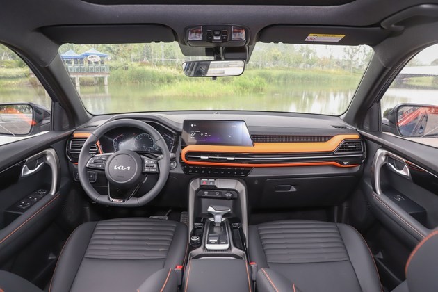 智跑Ace的内饰带来了全新的设计风格,首先要夸赞的便是与外观相呼应的橙色装饰,一下子使得内饰灵动活泼起来。此外映入眼帘的便是中控台区域横贯一体的空调出风口,这种设计拉宽了车内视觉效果。与现款车型变化不大的只有三幅式平底方向盘,但中央换装了全新的品牌Logo。方向盘的多功能按键有语音交互按钮、模式切换按钮、定速巡航以及车道保持等按钮。没错,新车配备了DRIVE WiSE智能驾驶辅助系统,包括自适应巡航、车道保持以及将车辆保持在车道中央等功能,这些配置可以减轻驾驶时的疲劳度。