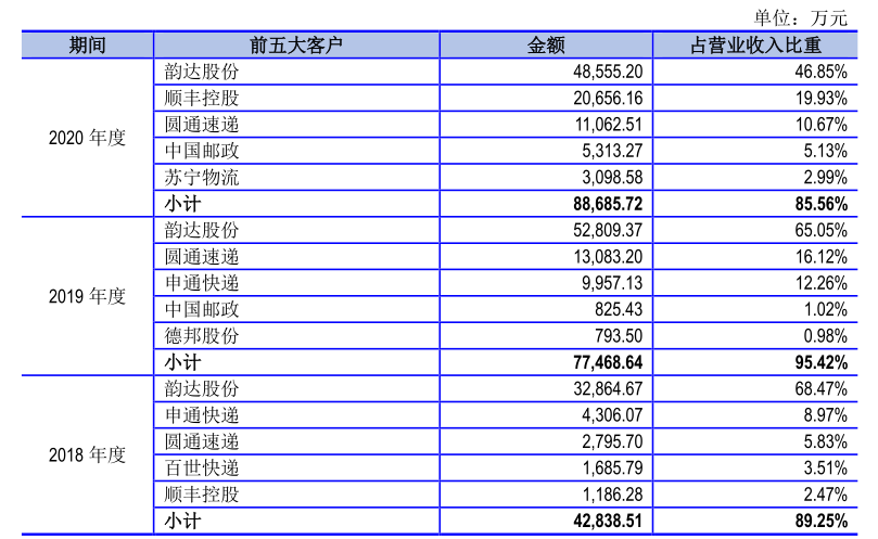 一、高度依赖快递行业 单一客户占比超60%