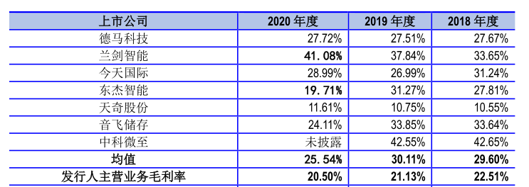 招股书显示,2018年-2020年,欣巴科技主营业务毛利率分别为 22.51%、21.13%、20.50%,逐年下滑迹象明显。此外,通过下图还可以看出,报告期内欣巴科技毛利率远低于同行可比公司平均值。
